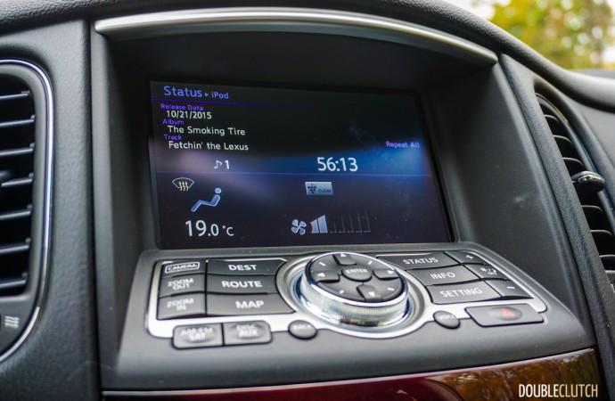 The overall infotainment setup in this Infiniti is a bit old, but is relatively simple to use. Media and navigation inputs can be done via the touchscreen, but there is a nice rotary dial with actual usable buttons. My challenge here was that the controller is located directly beneath the screen, so there’s no real location advantage to it. If it were a bit closer within arm’s reach, I could see more reason to use it and keep fingerprints off the screen itself. Infiniti has implemented some interesting new technology on board for 2016 though, and this includes an industry-first Distance Control Assist. This feature is neat, as it coaxes the driver to release the throttle and automatically applies the brakes as traffic slows down.