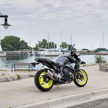 Touring the best secondary roads I could find between the Niagara region and Collingwood, Ontario, Yamaha’s naked litre bike felt as light and playful as a 600 cc sport bike, but with a lot more gusto. And despite the R1’s clip-on bars being replaced with a more comfortable perch (relieving pressure on wrists and neck), it’s plenty easy to throw the FZ-10 into a corner, and even easier to maneuver around town due to the increased leverage of the wider bars.