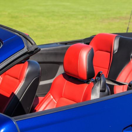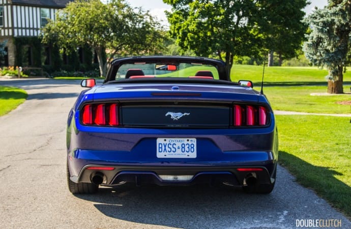 The Mustang EcoBoost Premium convertible starts at $38,804, and our test car comes equipped with the 201A equipment group ($2,000, Shaker Pro audio, driver’s seat memory, blind spot monitoring), EcoBoost Performance Package ($3,000, shorter final drive ratio, 19-inch gloss black wheels, additional gauges, firmer springs, additional cooling, bigger brakes, larger rear sway bar), adaptive radar cruise control ($1,600), satellite navigation ($800), and the red premier colour accent seats ($440). In short, this Mustang is fully loaded. This brings the as-tested price to $45,756, before taxes and additional dealer fees. For what it’s worth, I priced out a similar Chevy Camaro Convertible with the V6 and RS package, and came out to within a few thousand dollars.
