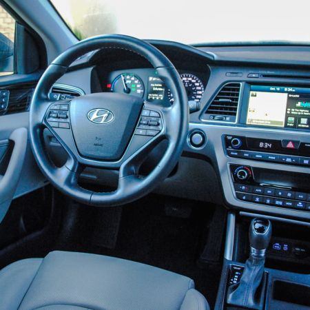 On the road the cars actually feel very similar. And they should, because they’re both midsize sedans powered by 2.0L Atkinson cycle four-cylinder engines, assisted by electric motors. The Fusion’s 7.6 kWh electric and 2.0L gas motors combine for a maximum output of 188 horsepower, while the larger 9.8 kWh setup in the Sonata helps get the output up to 203 horsepower. Both cars are agile when moving solely on the torquey electric motor, but once that’s depleted and you’re on standard hybrid mode, feel sluggish under the additional weight of the system.