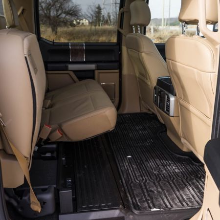 The Lariat Ultimate Package ($5,675) takes the level of luxury to another level, adding a massive twin-panel moonroof with a retractable shade, which gives the cabin a more open feeling. Also, included are some power options that make living with the F-350 a little more convenient, such as intelligent access with push-button start, driver’s memory seating, and power telescopic steering with a wheel. This package also adds a feature not found within the cabin; a class exclusive tailgate step that stows away in the tailgate and provides an easy way to step into the bed.
