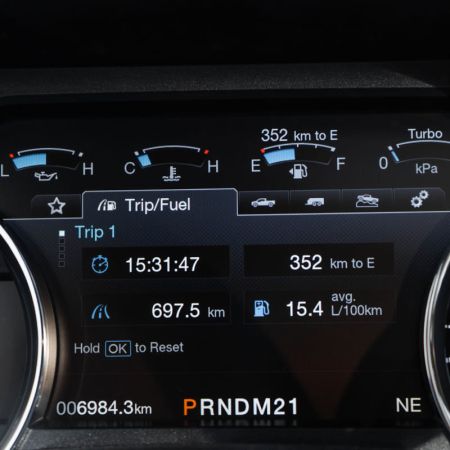 The SYNC 3 (reviewed here) infotainment system flourishes just as it does in other newer model Ford vehicles. It’s a responsive unit with properly functioning voice recognition (surprisingly rare these days!), along with the 8” touchscreen. Drivers can also use a digital productivity display at the centre of their instrument cluster to display useful information like fuel efficiency and towing data.