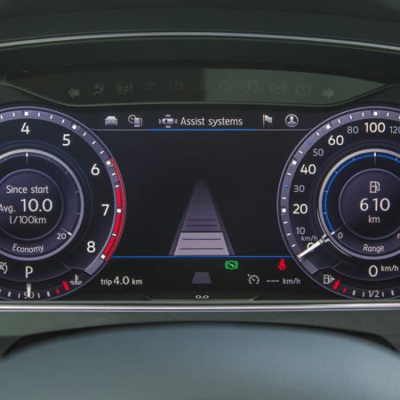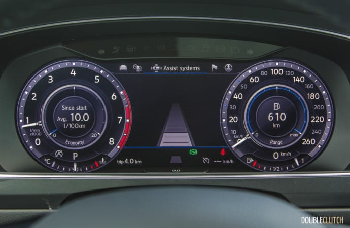 Politely greeting you in the dash is a large, 12″ LCD instrument cluster that is deeply recessed allowing for easing reading. Volkswagen offers a large array of preconfigured displays but all of them put the tachometer on the left and speedometer on the right, leaving an oddly empty large middle section. Granted, it is used to display text like instantaneous fuel economy, trip meters, immediate navigation directions but it hardly occupies half the real estate available there. This combined with the telescoping and tilt adjustable steering wheel, the dash upper portions can easily get covered by the steering wheel hiding most ranges of highway speeds on the speedometer: a common issue with most vehicles today.
