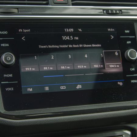 Conveniently off to the right is a rather large slab of glossy center console armed with an 8″ infotainment touchscreen with the classic volume knob easily within reach. The system is very responsive and is bundled with Bluetooth audio, USB, auxiliary inputs, and last but not least Apple CarPlay and Android Auto. The latter of which however, whilst great to use, will not take advantage of the center display of the digital dash. Volkswagen will instead simply remind you that you are running an app and not show any information (song / call / navigation) that would otherwise be displayed on the main infotainment screen in any other mode (Bluetooth or USB media).