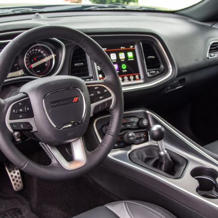 The interior of the two-door Dodge is pretty much on par with its rivals. This year sees an update to UConnect that adds Apple CarPlay and Android Auto. We compared the screen resolution to those offered by Ford and General Motors, and it’s much better to look at and operate. This remains the benchmark system in the segment. Overall interior quality is about right for the segment, with plenty of visible plastics and some panel gaps larger than we’d like to see. The driving position overall is quite good, and the leather seats are comfortable and supportive for extended drives. Fore-aft adjustment on the headrests would be a welcomed addition.