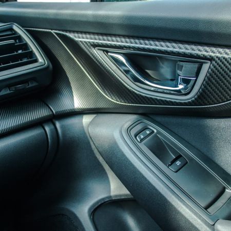 Greeting your vision are the two white dials on the dash; tachometer and speedometer. They are easy to read with a center-mounted LCD nestled between them. The HVAC controls are conveniently mounted underneath a dual-screen infotainment screen with the larger 8.0″ touchscreen front and center, and a smaller but wider display tucked underneath the windshield. Everything has a nice shine to it around the center console but Subaru’s insistence of splashing faux carbon fiber comes off as trying a bit too hard.