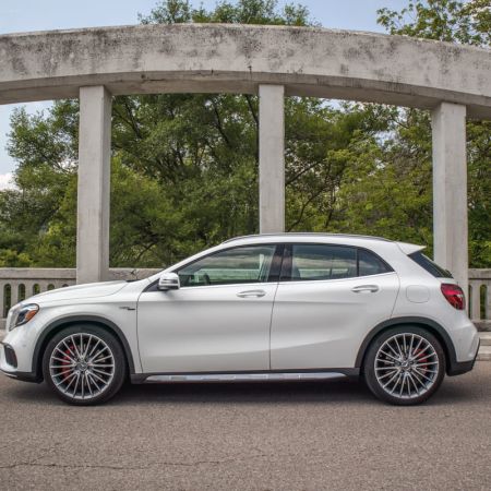 Sitting at a base price of $52,300, the 375-horse GLA 45 is a pretty wicked value for what you get. This test vehicle was optioned with a $4,300 Premium Package (dual-zone climate control, LED headlights, navigation, blind spot assist, Apple CarPlay/Android Auto) and a $2,900 Premium Plus Package (Active Park Assist, power folding mirrors, Harman/Kardon Logic7 sound system, power tailgate). The real icing on the cake is a $3,000 AMG Driver’s Package that adds 20” wheels, sport suspension, Nappa/Dinamica performance steering wheel, and the AMG Performance Exhaust. This almost fully loaded example stickers for $62,500.