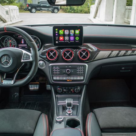 Stepping into the GLA 45, the interior is quite nice if headroom isn’t a priority. The updated steering wheel feels great to hold, and the large eight-inch center screen is now capable of running Apple CarPlay/Android Auto. The GLA is still one of the few Mercedes-Benz models that still uses the old dash layout with the telephone number pad, but the classic climate controls are very easy to use and make for minimal confusion. The large panoramic sunroof helps bring welcomed light into the cabin, but it’s worth a mention that this is a fixed unit and does not open