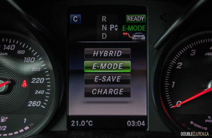 Above and beyond the standard drive mode selection, the GLC 350e adds hybrid driving modes. The vehicle can default start in either “E-Mode” or “Hybrid”, depending on how much of the battery has been depleted. The former will drive as many kilometers as possible in full EV mode, and the latter will operate as a conventional hybrid. There is also an “E-Save” mode that can save EV range for later in your commute, ideal if there is a city portion. Lastly, a “Charge” mode makes exclusive use of the gasoline engine to generate more EV range. This consumes more gasoline in the process, but makes sense if you have no ability at all to plug the vehicle in.