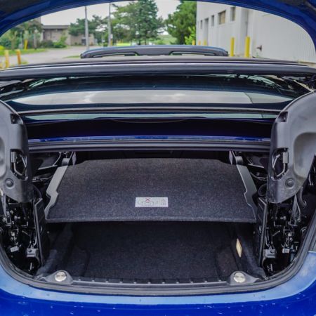 Trunk space in the 440i Cabriolet is a bit of a different animal than with a soft top. There is a hard shelf in the trunk that outlines the available trunk space for top-down driving. You can lift the shelf up and use the entire trunk space, but the roof will not begin to collapse until that shelf is in the lower position and nothing occupies the space above or to the sides of it. On the flip side, actuating the buttons on the trunk lid will lift up the hatch and rear roof assembly so that you have a larger trunk opening to get something into the trunk, and then collapse it all back down.