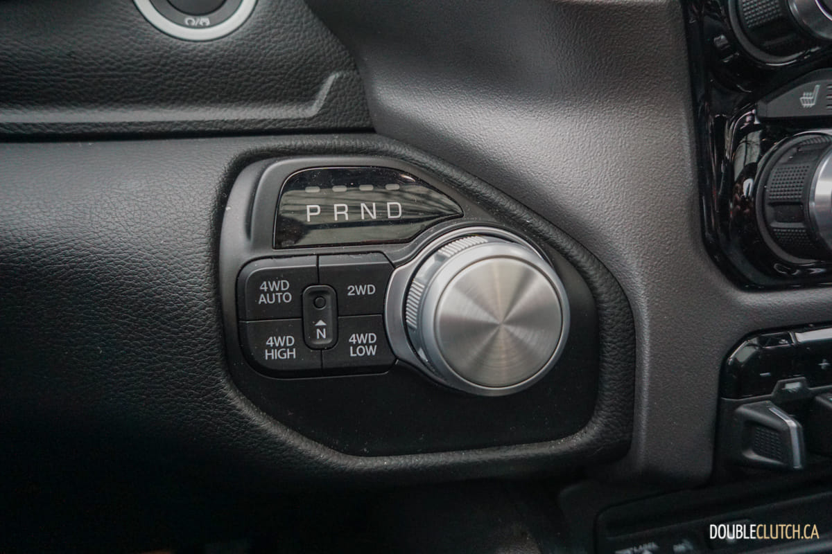 Behind the brawny V8 is strapped an eight-speed automatic transmission and 4×4 transfer case. Shifting is smooth and kept the engine revs in check so well that it takes effort in every day driving to get to hear the roar of the HEMI. Gear selection is done via a knob on the dashboard that takes some getting used to. Our biggest complaint is that there is no physical resistance in the knob between the R and P positions. As a result, sometimes while quickly switching directions while trying to back up a trailer, the truck ended up in “Park” annoyingly.