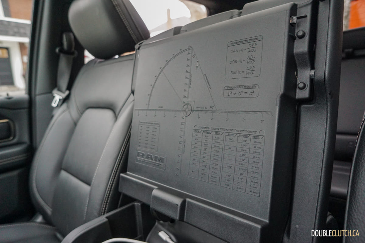 The center console hosts some neat features that some drivers might enjoy. There’s a perfect spot to stick your phone, while hiding all of the wires deep down, and little slots to route the wire through so there’s no mess. The pieces of the console are all movable and configurable so you can accommodate whatever junk you typically keep around there or move the cupholder to just the right spot. To top it all off, there are common measurement conversions, formulas and a protractor stamped into the underside of the armrest for quick assistance when on the jobsite.