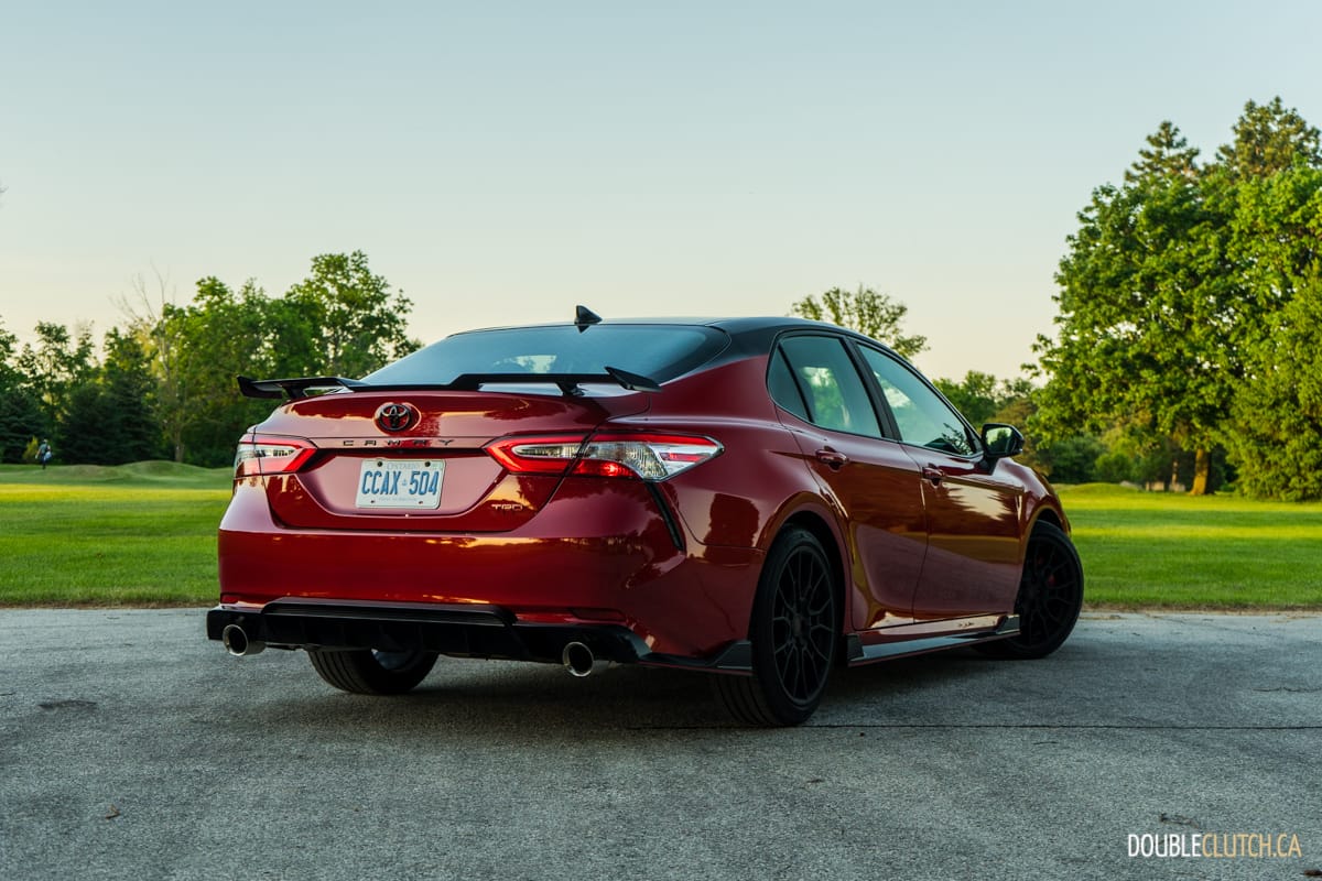 Launched alongside the Avalon TRD that isn’t sold in Canada, the Camry TRD takes the standard midsize sedan with the V6 engine, and strips out a few of the niceties in the XLE and XSE (reviewed here) models. They’ve added visual cues like TRD-specific 19-inch black wheels, a full body skirt package, and a ridiculous wing spoiler on the trunklid. There’s also a rear diffuser, and dual exhaust tips that emit more rumble than the standard XSE. The Camry is already an aggressively styled sedan, so these additions may be a bit much for some. Regardless, the Supersonic Red paint looks great and has some depth to it.
