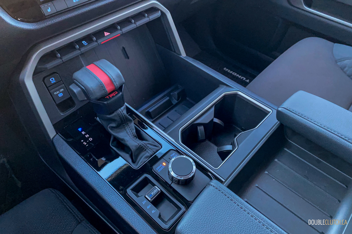 While the exterior redesign is a winner, the new interior design is a revelation. As we first climb into the cockpit it’s almost surreal feeling being in an all new Tundra. It looks like an interior that will not be outdated for some time with clean lines. As we prod at all the new switch gear we can tell extra attention has been paid to the touch points providing great tactile feedback. Operating the mode select dial, center cluster toggles and 4WD switch is very satisfying with real heft and satisfying feedback. The tops of the front doors have a large supple surface perfect for comfortable arm resting.