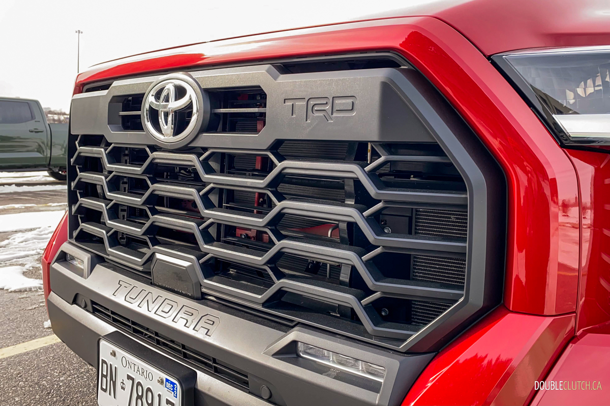 When it comes to fuel economy, this new Tundra has more new tricks up its sleeve. Tucked in behind the front bumper is an active front spoiler that automatically deploys at 60 km/h forcing air to move around the truck rather than under it, reducing drag at higher speeds and improving stability. Behind the grill are active shutters that open and close to manage aerodynamics and cooling depending on the driving conditions.