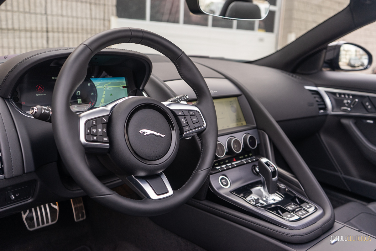 Inside the F-Type, materials are scrumptious. Being a roadster, space is rather tight, but my six-foot frame fit with no issues. Keep in mind there isn’t all that much room for daily carry items within the cabin. Our tester’s interior was finished in black leather and thankfully, had minimal use of piano black plastic. The 10-inch touchscreen has Apple CarPlay, though does require a wired connection. The 12.3-inch digital instrument cluster is crystal clear and offers all of the pertinent information and a fair bit of customizability.