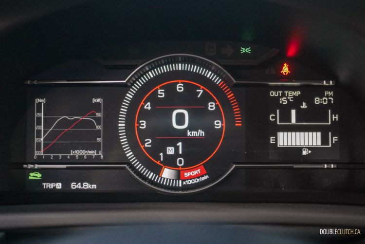 The seven-inch TFT display has all sorts of fun performance-oriented gauges and displays to choose from such as a G-Force meter and a dyno graph that traces your current position in the power curve. Another neat touch is how the tachometer focuses on the 3,000-7,400RPM range when track mode is selected. The eight-inch touchscreen is big enough for modern standards and blends in both appearance and ergonomics. Wired Apple CarPlay and Android Auto keep the experience up to date and the eight-speaker sound system works well.