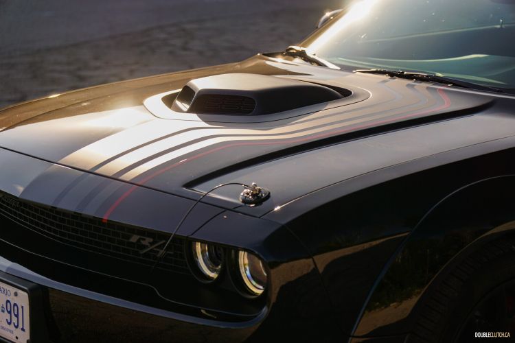 Even though our test car is draped in triple-black funeral garb, this is more meant to be a celebration of life than a mass mourning. Said dark duds come courtesy of the Shakedown package, one of the several special editions Dodge is rolling out as part of the Challenger’s end of life. It’s available on the 5.7L V8 (now badged 345) R/T models as well as the angrier 392 cars, and sports distinct black stripes with a shaker hood that doesn’t really shake, classic cotter pins that don’t actually do anything, and subtle-ish red highlights for a little demonic flare to the funeral attire.