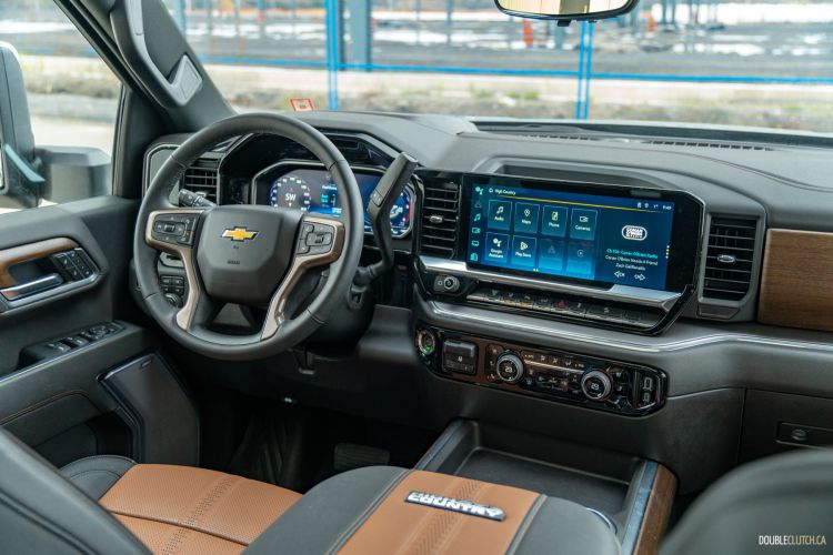 Our High Country tester features a suitably high-class cabin, with soft Jet Black and Umber leather with contrasting stitching and lots of open-pore Paldao wood trim, helping the Silverado HD’s cabin feel like a literal luxury cottage. Despite the cottage feel, there’s no shortage of slick tech here, as all but the most basic trims get a new 12.3-inch digital gauge cluster, flanked by a 13.4-inch touchscreen to house the Google-powered infotainment, augmented by a 15-inch heads-up display.