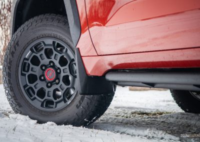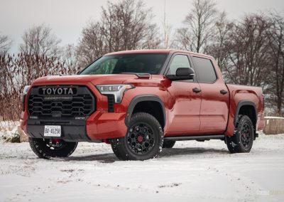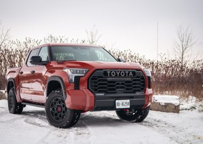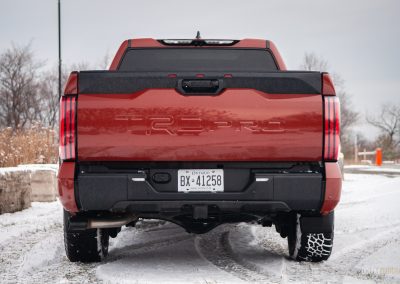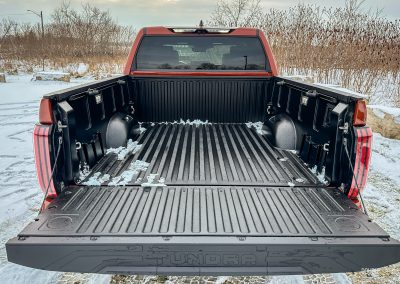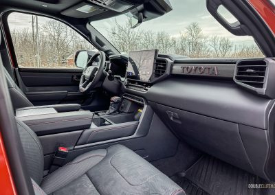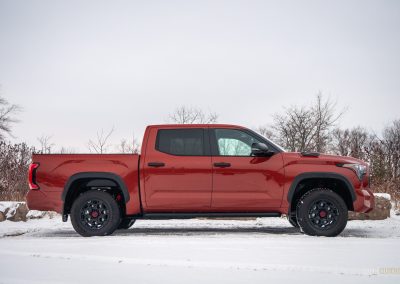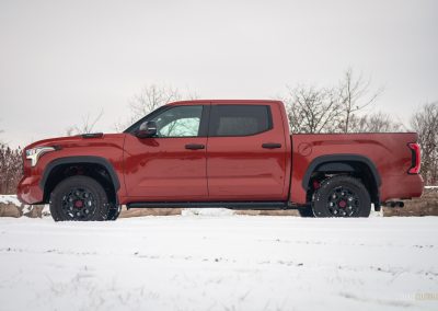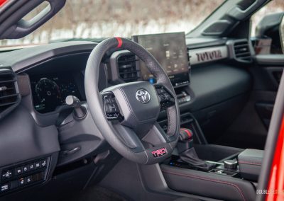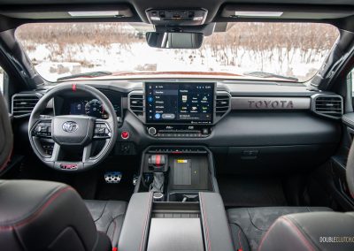 That said, we’re not quite sold on the electric side of the Tundra’s powertrain. Officially, Toyota rates the TRD Pro at 12.9 L/100 kilometres in the city, 11.6 highway, and 12.3 combined. That’s an appreciable bump over what Toyota quotes for the hybridized, non-TRD Pro variants, and the TRD Pro’s all-terrain tires no doubt play a big role in the added thirst. Still, we were surprised to see the trip computer settle at 16.2 L/100 km by the end of our evaluation. For reference, the last Capstone we had averaged 13.2 albeit in slightly warmer weather, and the last F-150 Powerboost we drove managed an impressive 11.8. Fortunately, the Tundra TRD Pro happily runs on 87, but we didn’t expect fuel economy to suffer this much.