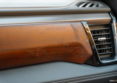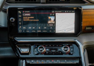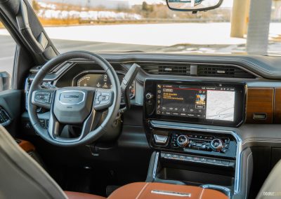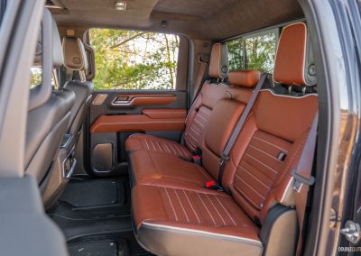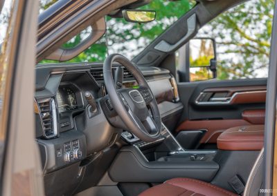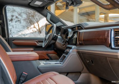 I can’t imagine why you’d be in a hurry. The Denali Ultimate’s cabin is absolutely lovely; a near-direct lift from the excellent Sierra 1500 Denali Ultimate. All Ultimates get the same interior, a two-tone black and baseball-glove-brown affair complete with contrasting cross-stitching and piping to accentuate the sumptuous full-grain leather. The dash is dressed with matte Paldao wood trim, with a topographic map of Mount Denali in Alaska engraved. Nerdy, yes, but a cool design all the same.