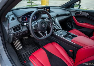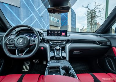 The interior doesn’t receive the same unanimous praise. For starters, despite being built on a different chassis and having a much larger overall footprint, the TLX somehow has less interior volume than the Integra. I’m not sure how Acura managed this, but if space is an issue, look elsewhere in the sport sedan segment — or just get an Integra Type S. Fit-and-finish is typical Acura; most touch points feel good, but not quite as nice as its German competitors. I personally dig the two-tone red-on-black interior, sharing a strong familial resemblance to the Integra and MDX Type S.