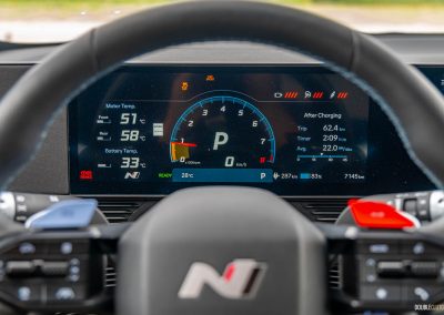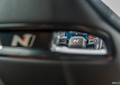 Visually, the 5 N differs from the standard Ioniq in a few ways. It’s slightly longer overall, the fender flares and upsized wheels give it presence, and jumping inside, the grippy Alcantara/faux leather sport seats keep you glued in place. The N badges on the seats light up and look great at night, and the thicker steering wheel wouldn’t feel out-of-place in a BMW M car. Come to think of it, the seats with the light-up badges wouldn’t feel out-of-place, either.