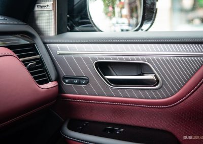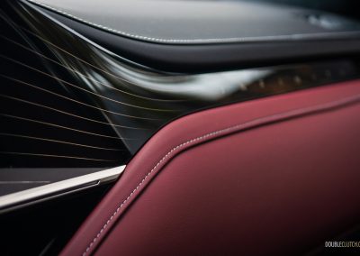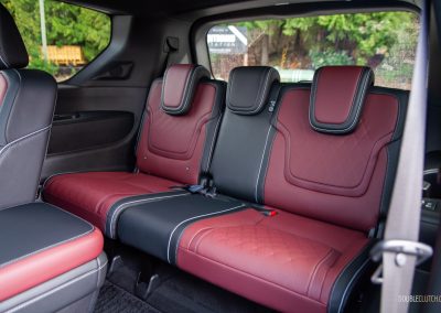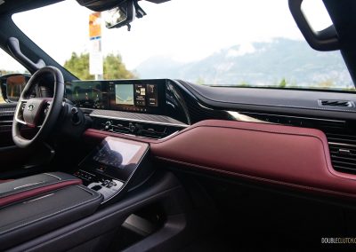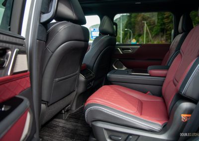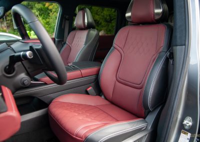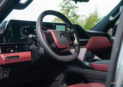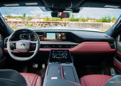 Inside, Infiniti promises that “every seat is first-class.” The QX80 certainly delivers with a pair of La-Z-Boy chairs up front, excellent fit-and-finish, and a new layout dominated by two 14.3-inch displays—living under one glass panel—spanning across the dashboard. There’s another nine-inch display below on the centre stack. This one is for adjusting the climate control and drive modes, and has with haptic feedback. They’re all crisp-looking, responsive, easy to use, and well-integrated into the QX80’s overall design. Best of all, there’s physical switchgear peppered throughout including a volume knob, but we’re not so hot on the liberal use of gloss black trim. Still, the flowing lines, open-pore wood trim, metallic accents, and top-notch materials all look and feel great.