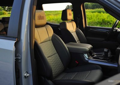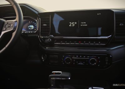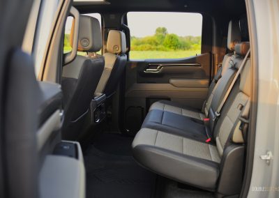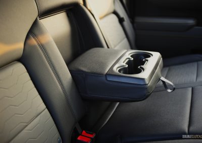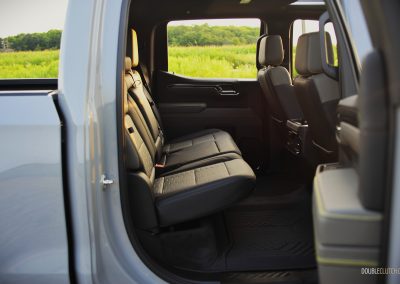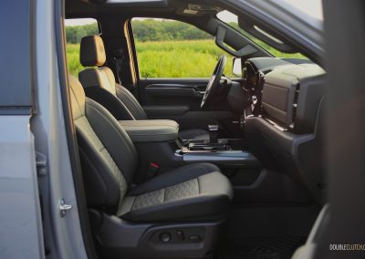 In terms of seating accommodations, the Silverado has plenty of room in the front and back due to the Crew Cab configuration. The front leather bucket seats are firm but slightly narrow due to the aggressive side bolstering. They do hug you while taking tighter corners, though it is more apt for a sports car or sports sedan than a full-size pickup. These seats can become uncomfortable after a long drive, especially if you are a wider or heavier-set person. The lower seat cushion was also a little too short to my liking; I much preferred the seats in the Gladiator Mojave X and the F-150 Powerboost, as those two provided better cushioning and side bolstering that accommodates a wider range of body types.