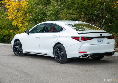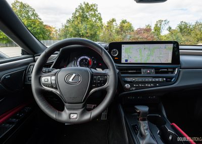 The interior is all Lexus, with excellent build quality and nary a cheap-feeling panel, squeak, or rattle to speak of. Most materials are soft to the touch, and the blend of textures are tasteful and well-executed, including the subtle silver trim and Mark Levinson speaker grilles. The red leather stretched across the F-Sport seats and doors is just enough and matches well with the black, although my nostalgia still has me a little confused as to why an ES can be had in such a sporty colour motif. Where’s the wood trim? Give me the wood-laden interior of the Ultra Luxury trim, because the ES is about luxury first and foremost.