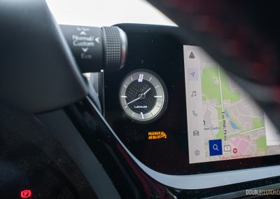 The gauge cluster is inspired by the legendary Lexus LFA, with a silver ring that physically moves based on what view you’re in. It looks like the screen itself moves, but it’s actually a neat party trick aided by clever graphics that follow the silver trim. Although the screen is small by today’s standards, it’s still adequate, simple to read, and the different drive modes change the look of the central tach. I dig it, especially when damn near every other automaker—luxury or mainstream—has an basic, uninspired rectangular screen.