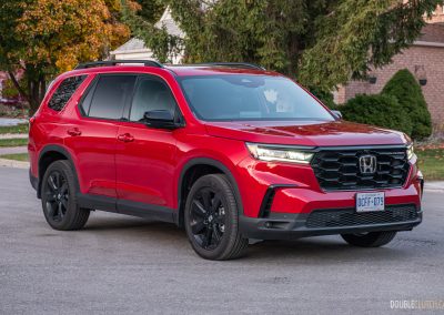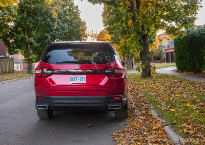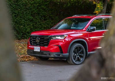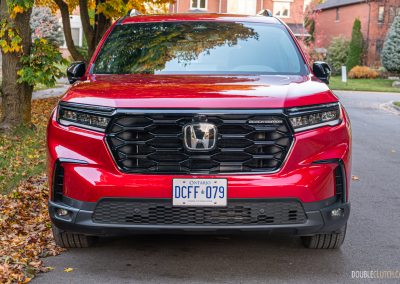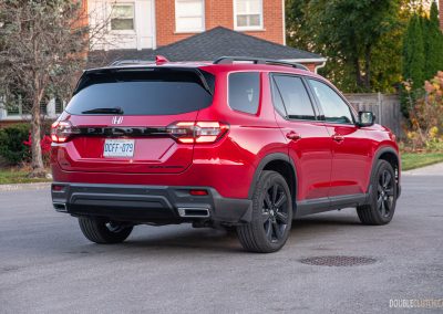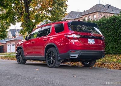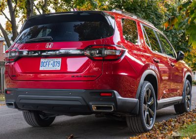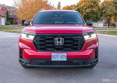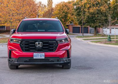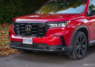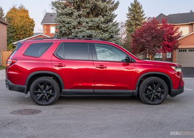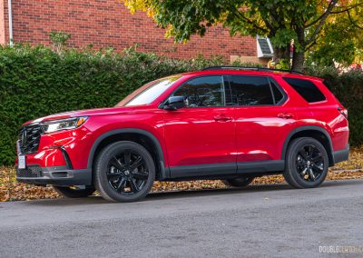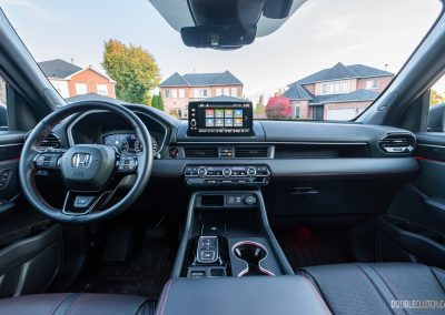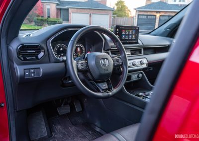 The Black Edition is a new trim for 2025, positioned above the Trailsport and Elite. It’s fully loaded, with blacked-out 20-inch wheels, the aforementioned blacked-out trim bits, and the requisite ‘Black Edition’ badges on the front grille and rear tailgate. The odd thing is that the Honda logo and exhaust tips are still chrome. I’m not typically a fan of these blackout packages in general, but contrasted against our tester’s deep red paint, it adds some much-needed panache to the Pilot. For 2025, Honda’s full suite of active safety and driver assists is now standard on all Pilots, which includes collision avoidance, adaptive cruise control lane-departure warning, and much more.