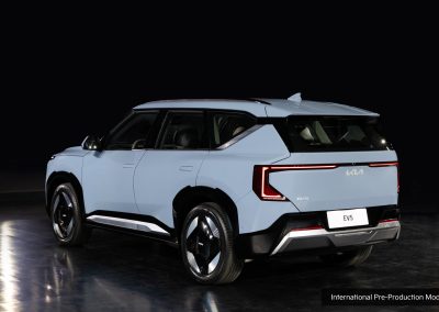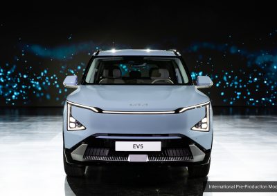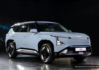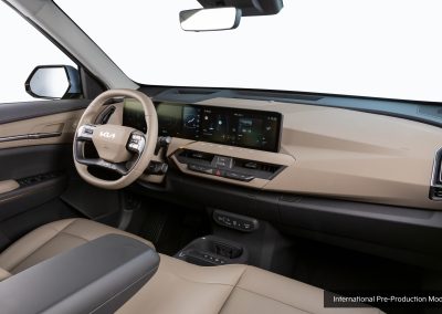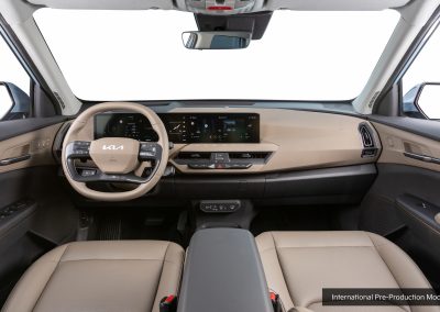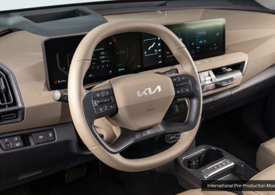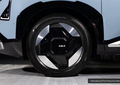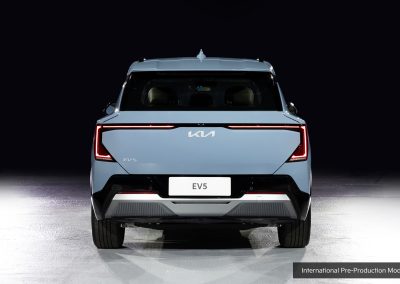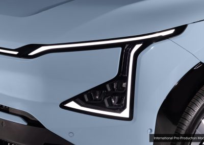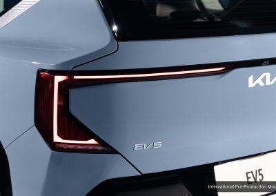 The EV5 is the third model to join Kia’s fully-electric-from-the-ground-up lineup, after the EV6 and EV9. It’s penned with Kia’s new, so-called ‘Opposites United’ design language we’ve seen rolled out across their gas and electric models, so there’s an immediate familiarity to the EV5. You don’t have to look too hard, or too long to pick out the design cues—the front and rear fascias and LED lighting, the chiselled character lines, the kinked d-pillar—that bear more than a passing resemblance to its big-brother EV9. The EV5 rolls on 18-, 19-, or 20-inch wheels depending on the trim level, and introduces Canadian buyers to two new colour options: Magma Red and Frost Blue.