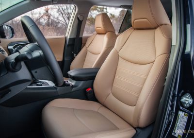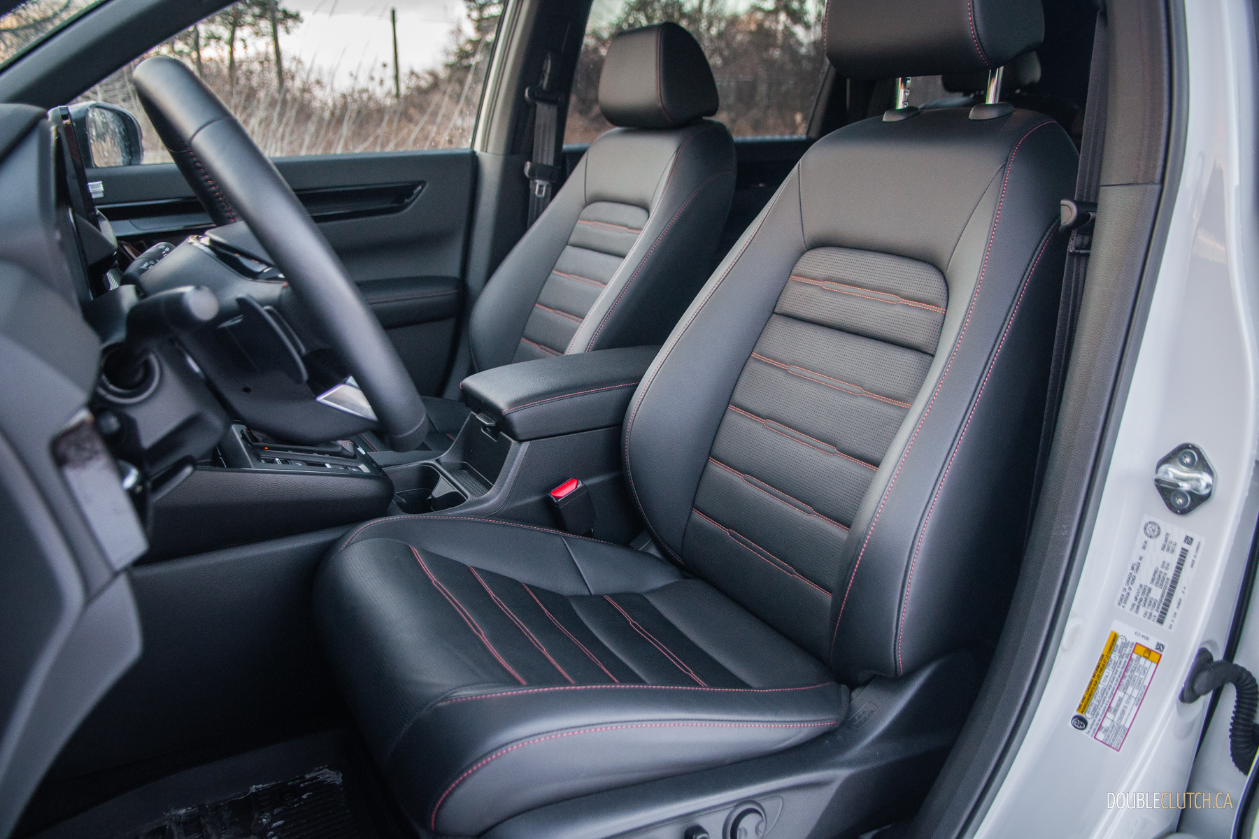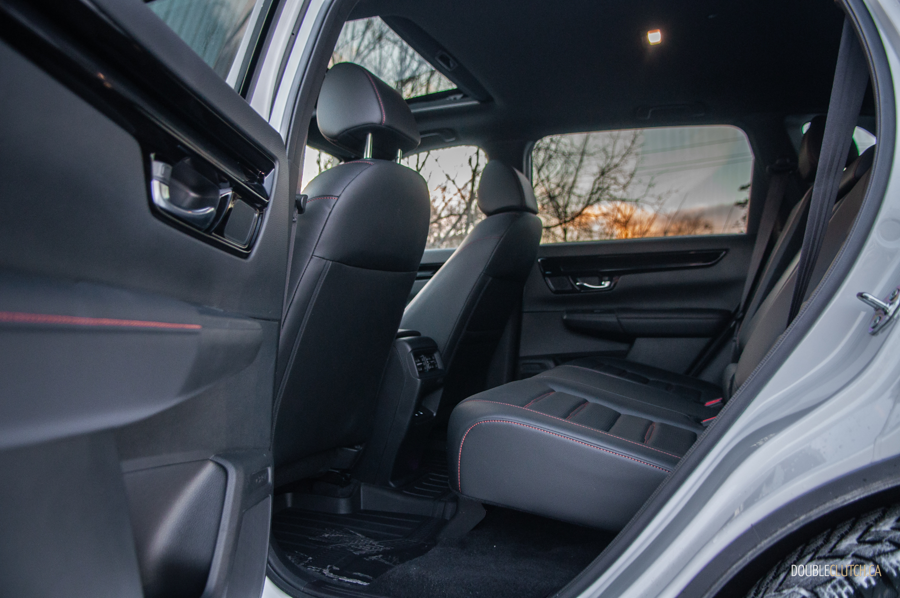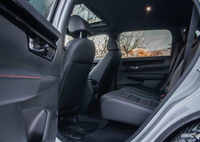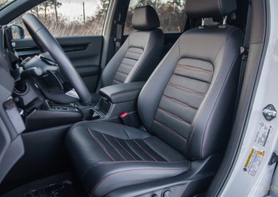 None of this is to say the CR-V’s cabin isn’t simple. In fact, visually, it’s a lot cleaner and more modern, but still logically laid-out with tactile, super user-friendly controls. I’d say the CR-V’s slightly larger buttons for the infotainment are easier to find than the RAV4. The Honda also employs softer, nicer-feeling leather, and everything from the centre console, dashboard, and door panels all share a unified, soft-touch finish that looks like leather. The CR-V certainly feels much more cohesive and upscale; I’d even say its seats are more comfortable, supportive, and have a wider range of adjustment. Plus, the CR-V’s more upright greenhouse and squared-off hood makes for even better visibility. I don’t want to say the RAV4 loses, but the CR-V is a clear-cut winner inside.