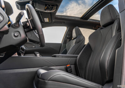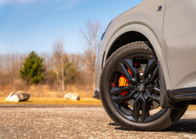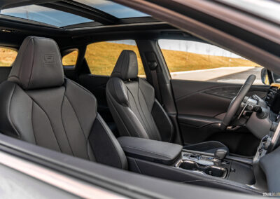 The Blackline Edition is a new trim level for 2025, based on the RX 500h and positioned at the top of the lineup, above the F-Sport Performance. I wouldn’t call its exterior design stunning, but it’s a very good-looking SUV and I appreciate that Lexus toned down the “spindle grille” up front. Our tester’s primer grey-style paint called Incognito, as well as orange six-piston calipers, 21-inch wheels, and subtle aero kit are unique to the Black Line trim. It’s handsome overall, but consider a BMW X5 or a Genesis GV80 if you want more attention.