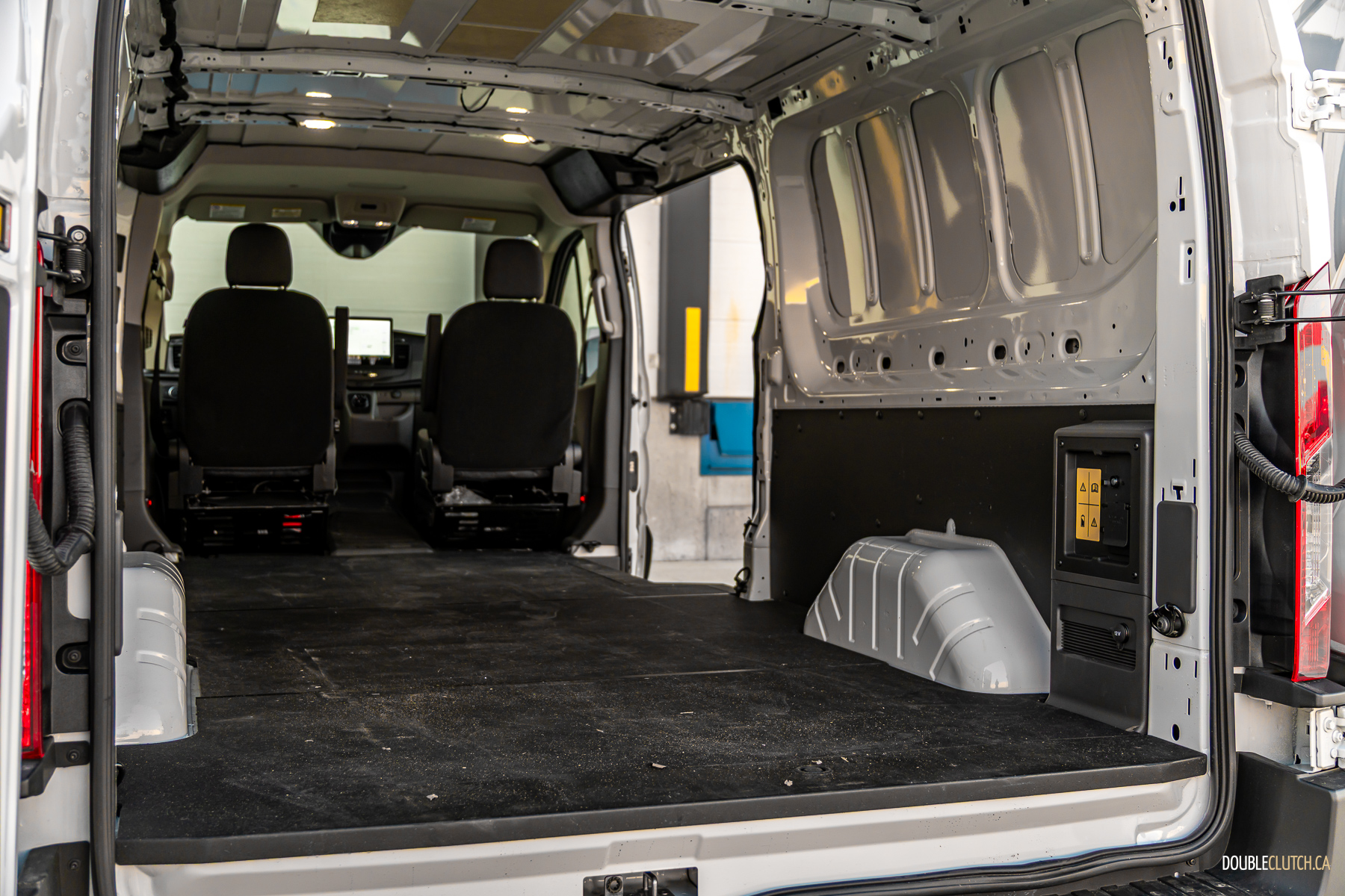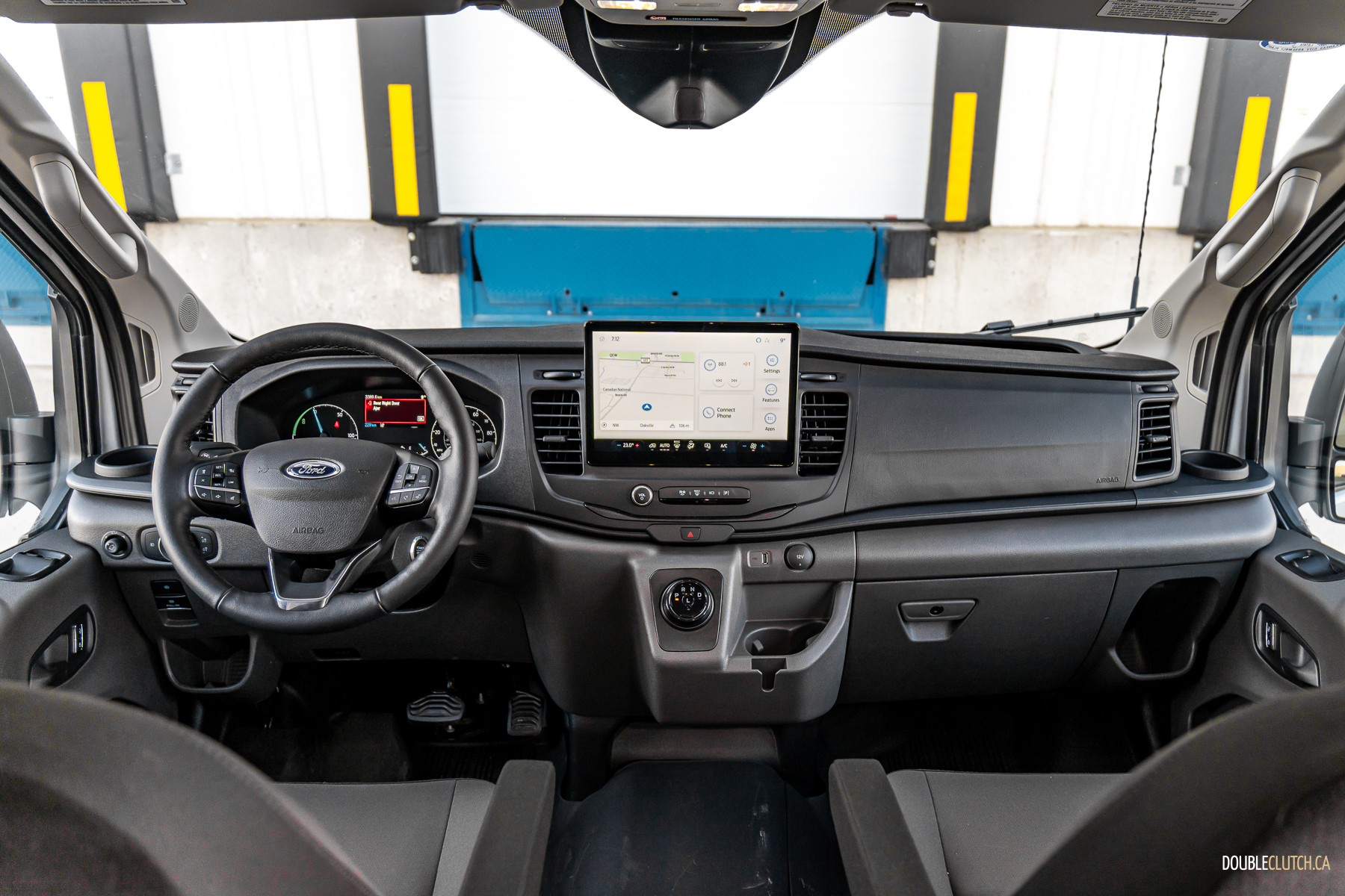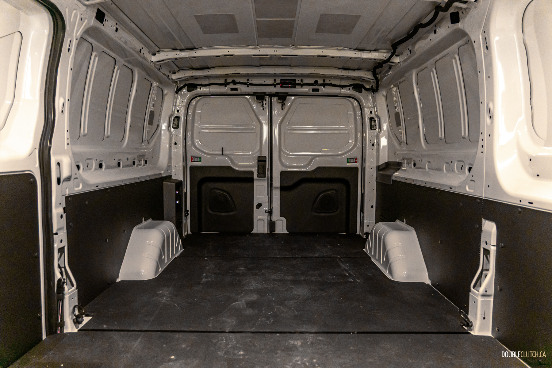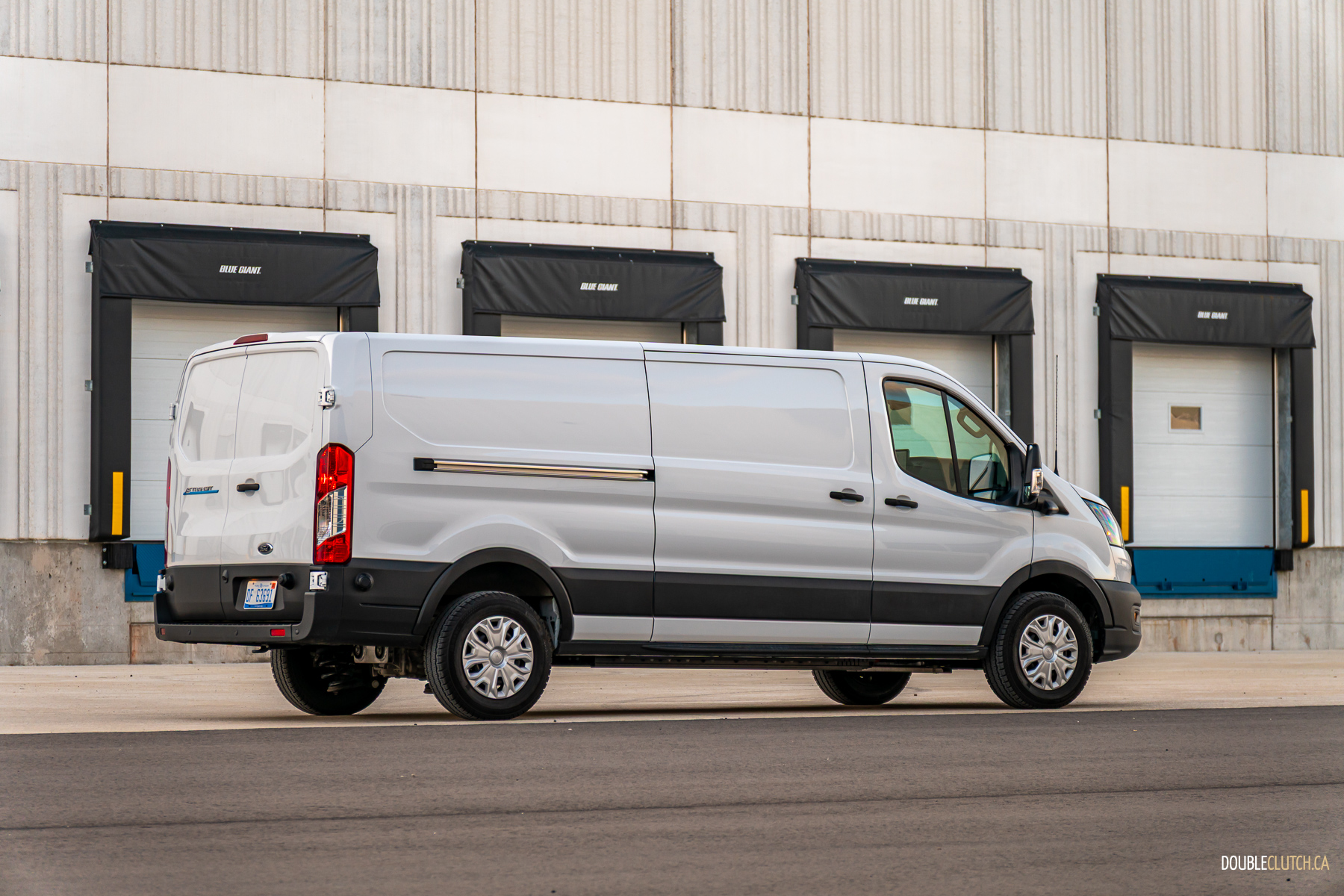With a maximum estimated range of 256 kilometres—238 and 230 km for medium and high-roof models, respectively—from its newly expanded 89 kWh lithium ion battery pack tucked under the floor, the E-Transit isn’t a viable candidate for anything that calls for extended highway jaunts on a regular basis. Towing isn’t advised, either; because of its switch to coil springs for the rear suspension rather than traditional leaf springs on the gassers, payload takes a slight 300-pound dip, but is still more than workable, at 3,250 pounds.