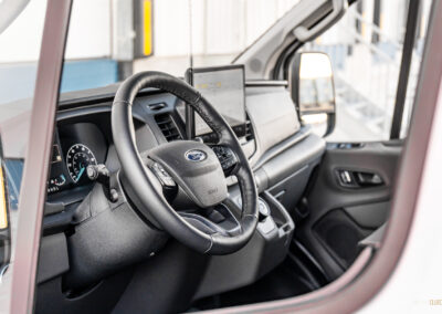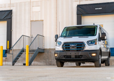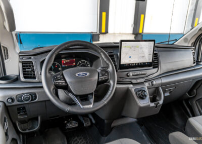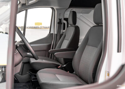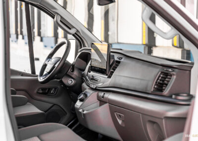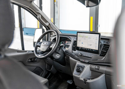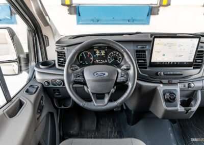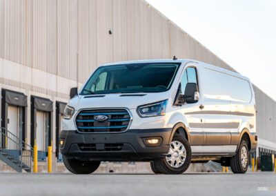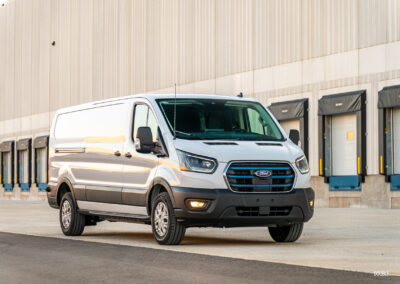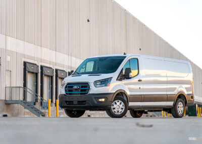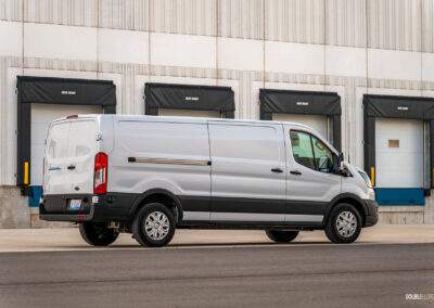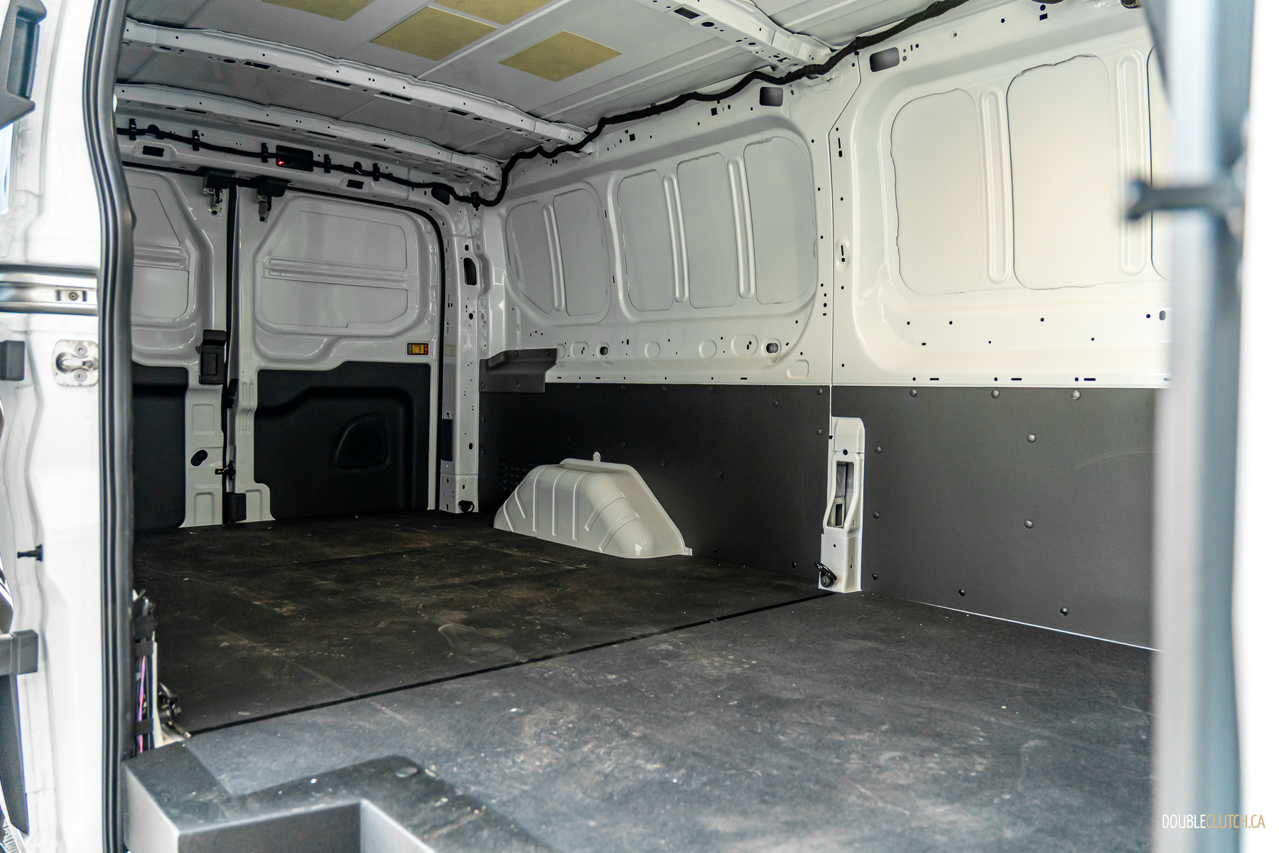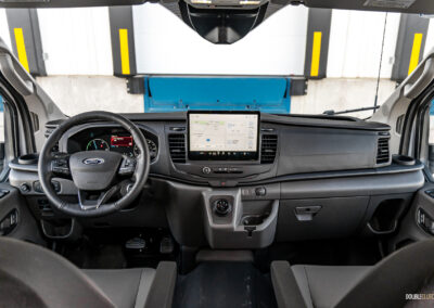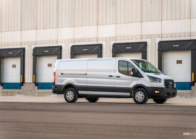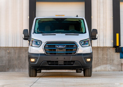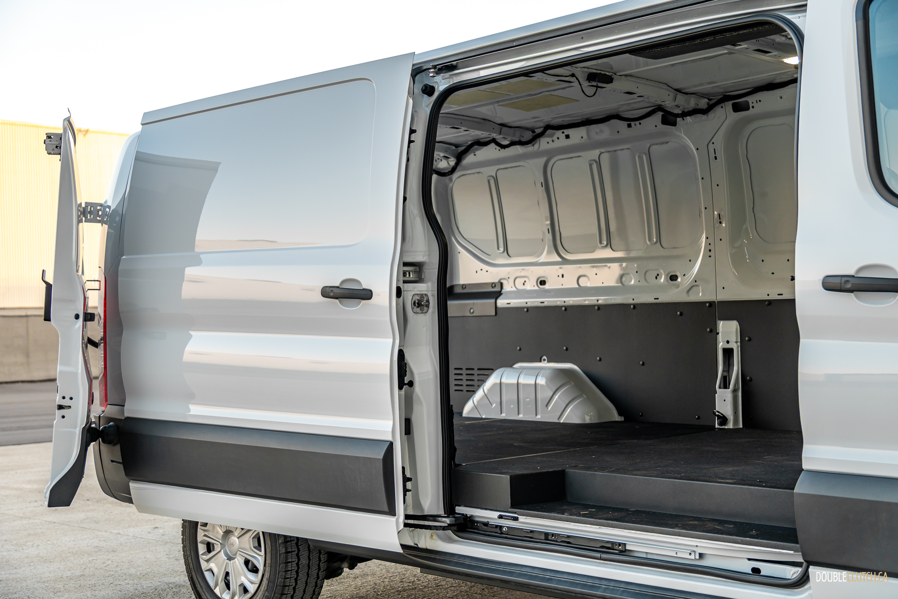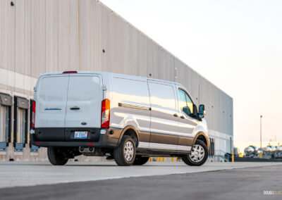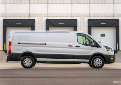 With a maximum estimated range of 256 kilometres—238 and 230 km for medium and high-roof models, respectively—from its newly expanded 89 kWh lithium ion battery pack tucked under the floor, the E-Transit isn’t a viable candidate for anything that calls for extended highway jaunts on a regular basis. Towing isn’t advised, either; because of its switch to coil springs for the rear suspension rather than traditional leaf springs on the gassers, payload takes a slight 300-pound dip, but is still more than workable, at 3,250 pounds.