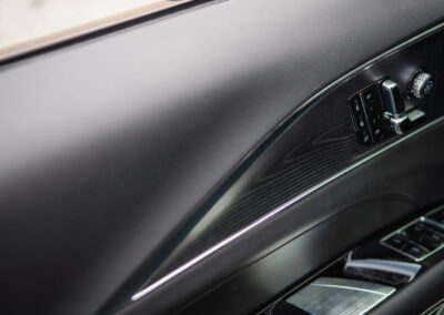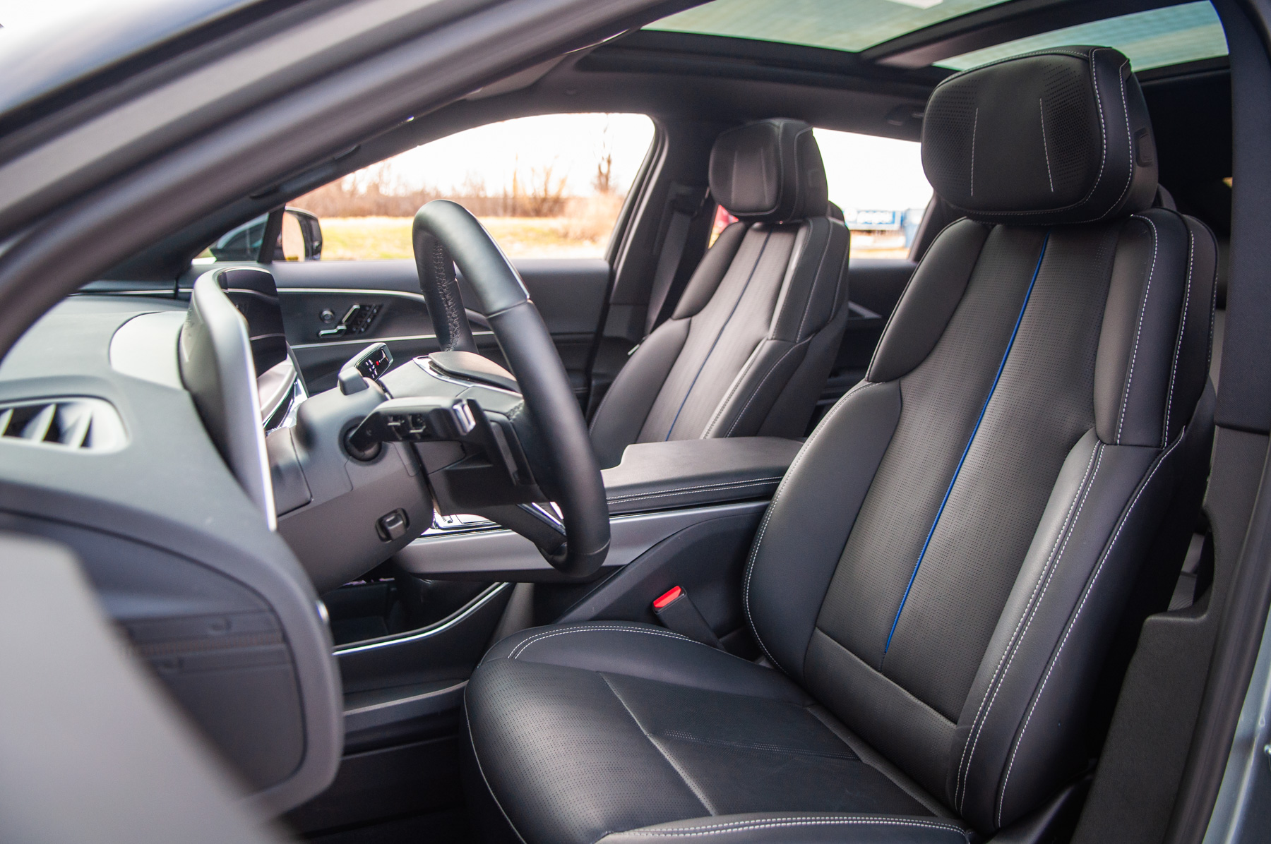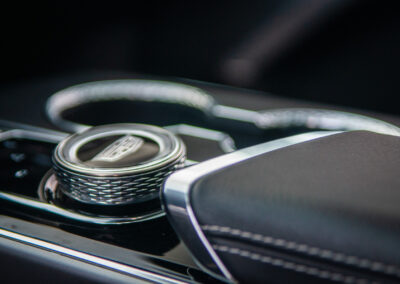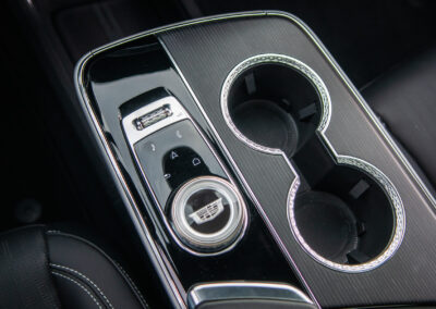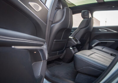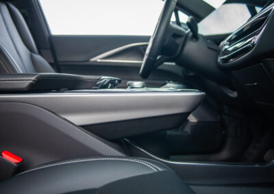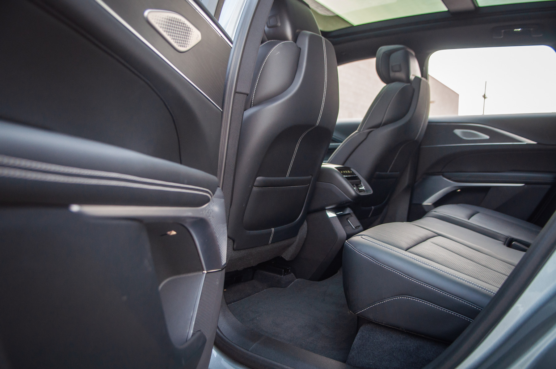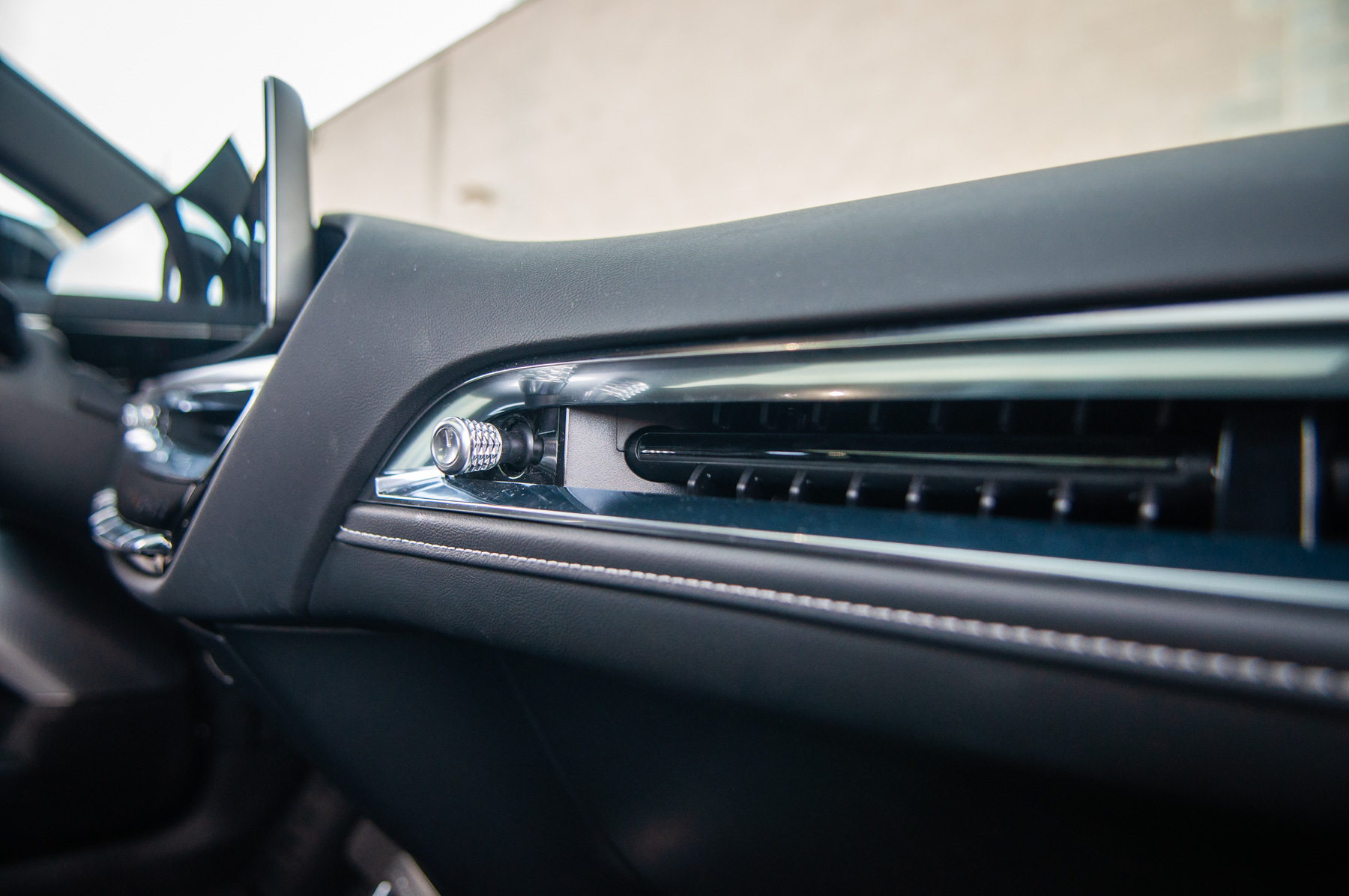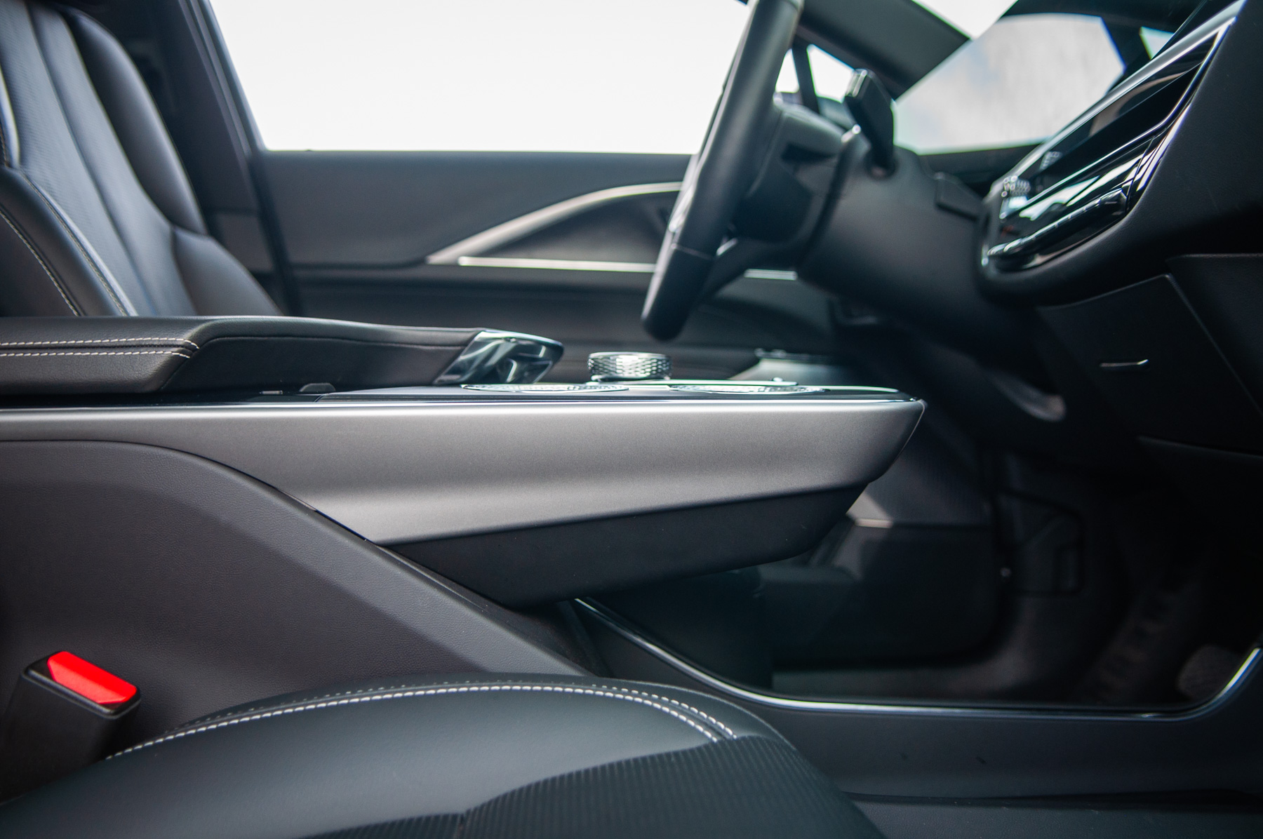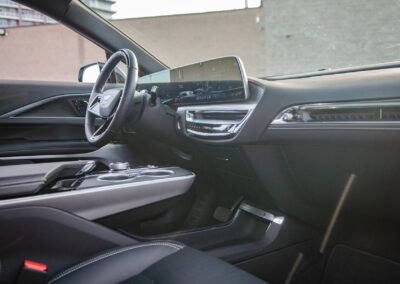 Inside, the Lyriq’s sheer width lends to a spacious cabin despite its rakish, coupe-like silhouette. It goes for minimalism like pretty much everything else these days, but Cadillac brightens up the space with a just-right mix of metallic accents, open-pore wood trim, and dimpled and knurled surfaces that look and feel lovely. The ambient lighting adds to the serene vibes at night, and unlike a certain other manufacturer also playing in the segment, it’s tastefully executed. Everything you touch, feel, caress, and interact with feels genuinely nice. If I had to nit-pick, the gloss black trim here and there cheapens the look, but fortunately there isn’t much of it.