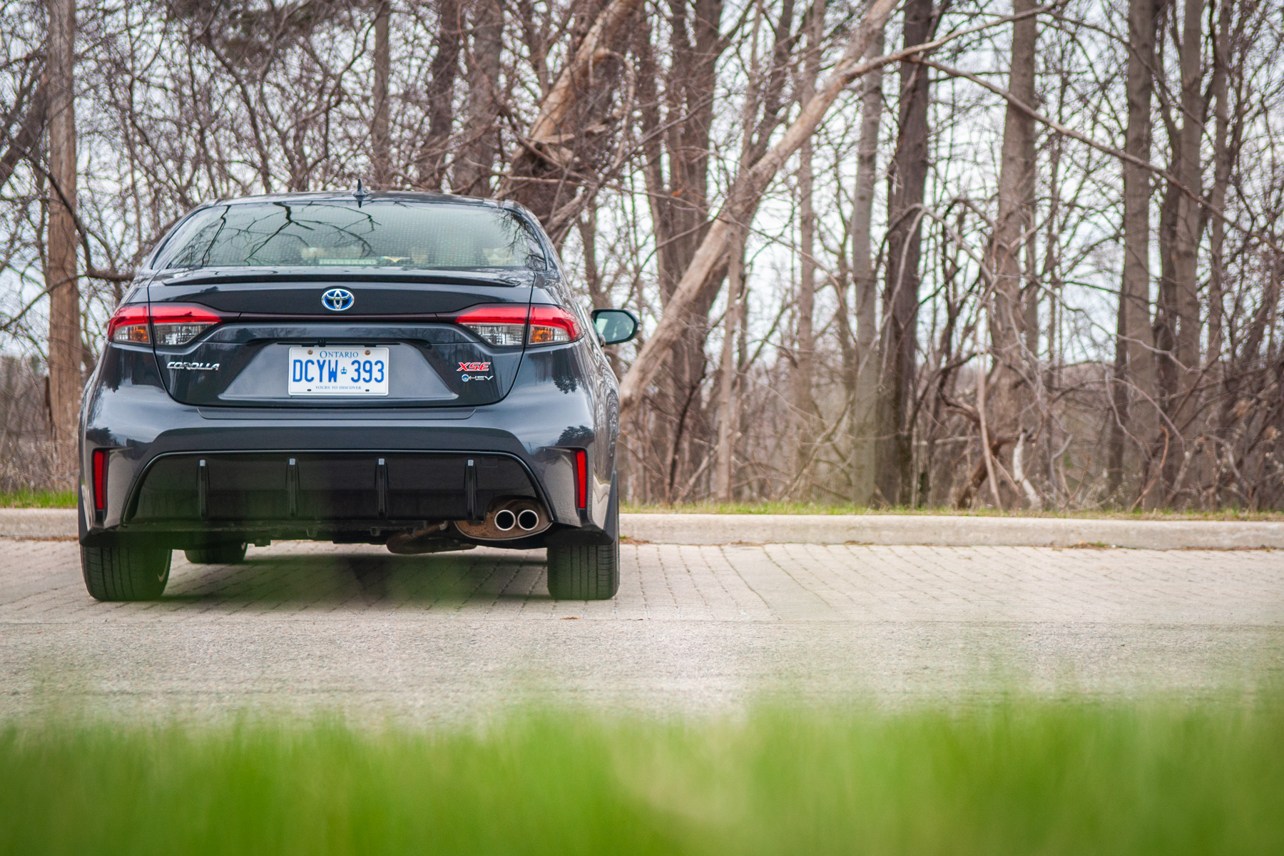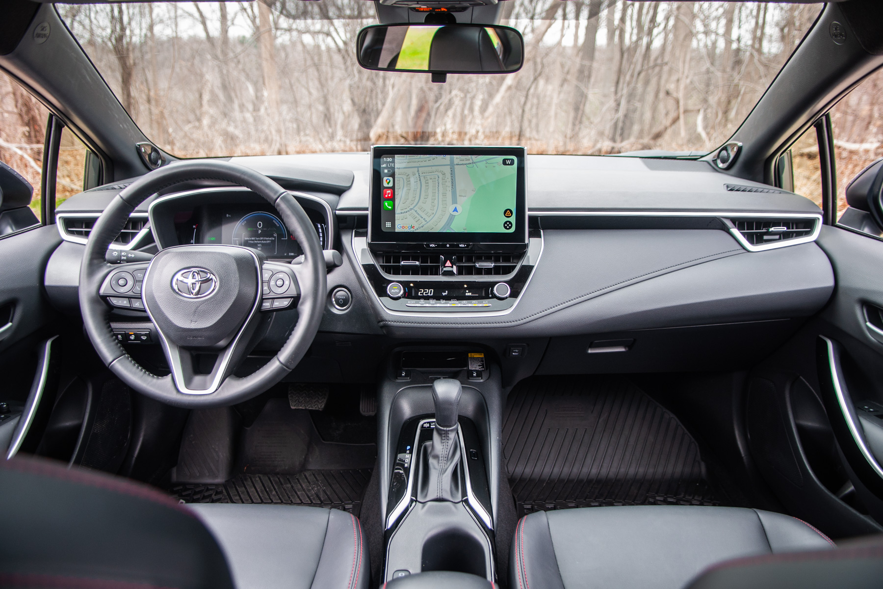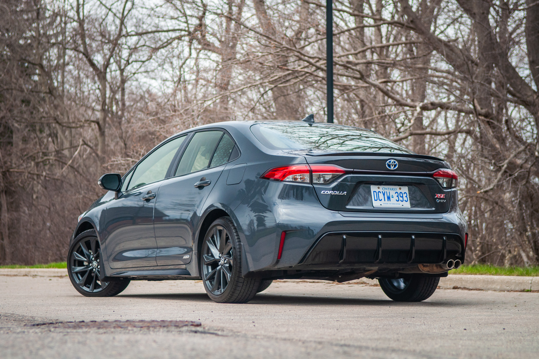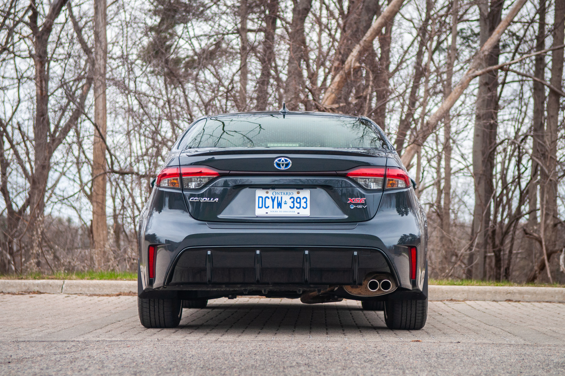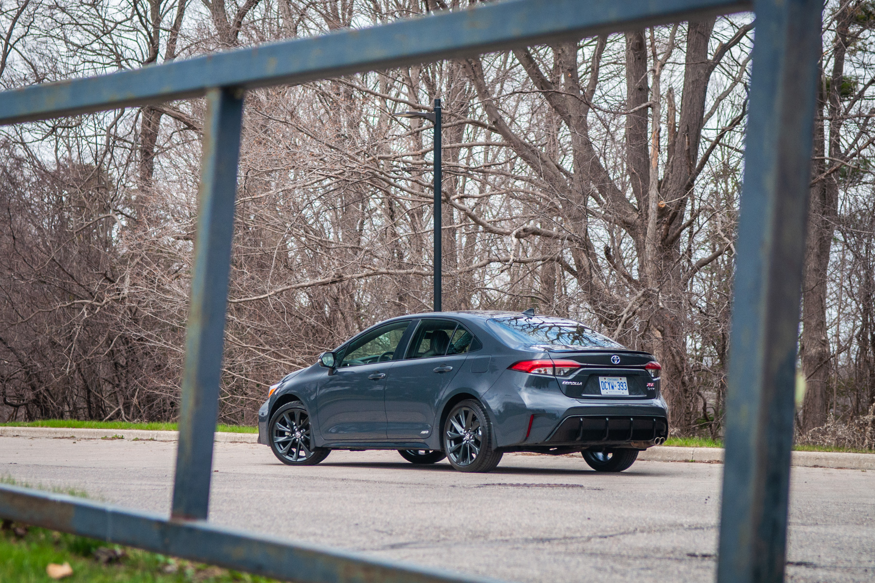 Quite the opposite. The Corolla blends in wherever you go, especially finished in our tester’s Underground paint, a darker take on the nonmetallic primer grey trend plaguing “colour” palettes. But blending in is perfectly OK for a commuter car like the Corolla; if the redesigned Prius is a bit much for your liking, the Corolla might be a better fit while still giving you the Toyota hybrid goodness. Our top-spec XSE tester sets itself apart from lesser Corolla trims with more aggressive-looking front and rear fascias, blacked-out 18-inch wheels and matching accents, and a subtle lip spoiler. It won’t turn heads, but it’s handsome enough and nowhere near as needlessly polarizing as a Hyundai Elantra or Kia K4.