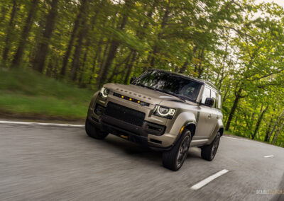 But the story isn’t just under the hood. It’s in the details. The cabin retains that industrial-chic vibe we’ve come to expect, but there are subtle touches that elevate the experience. Bronze metallic accents on the shifter, climate controls, and door pulls tell you that this isn’t just a more powerful Defender; it’s a more considered one. The seats deserve their own mention—deeply bolstered with optional adjustable back wings, they offer a sense of sportiness without veering into a track-day cosplay. Their only real quirk is that lumbar and bolster adjustments are tucked into the infotainment, rather than on the seat itself. A minor ergonomic miss in an otherwise flawless interior.