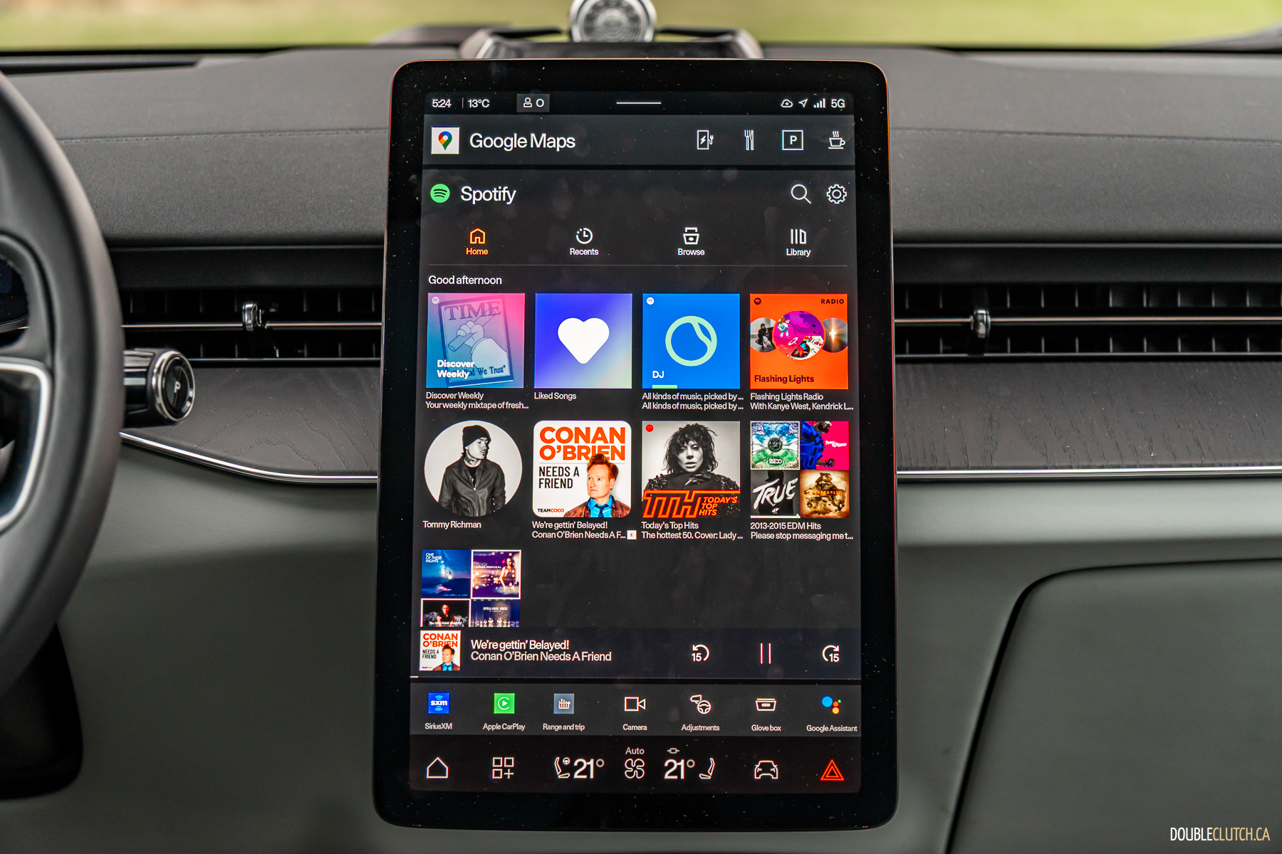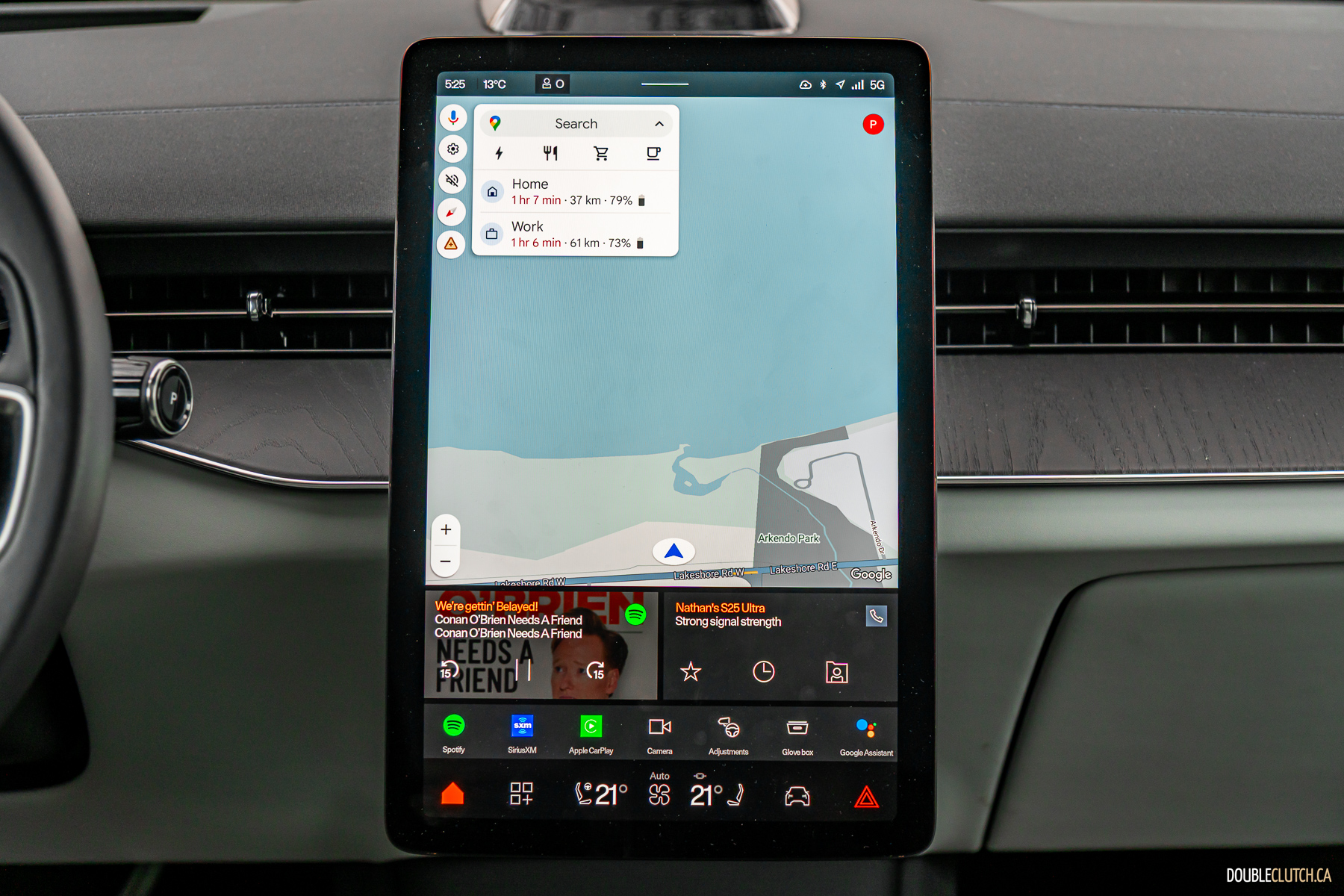 I wasn’t babying it, either. The journey was mostly highway, with cruise control set to 125 km/h, which unlike gas vehicles, uses a disproportionately large amount of energy. It was cool out, so the heat was running, it was still wearing inefficient snow tires, and the 25-speaker Bowers & Wilkins sound system was blasting the entire time. Volvo and Polestar’s range estimator algorithm can seem wonky with wild swings of optimism and pessimism, as average energy use resets following a charge cycle. It proved to be very accurate over a long haul, if just a tiny bit negative, as it probably should be.
