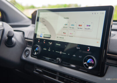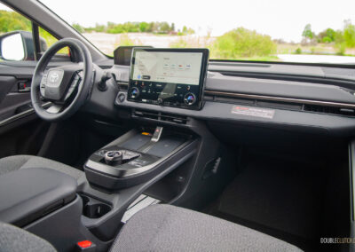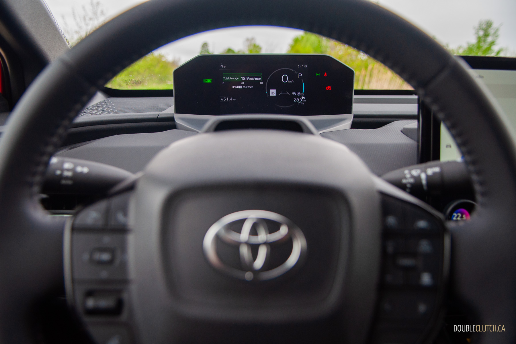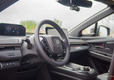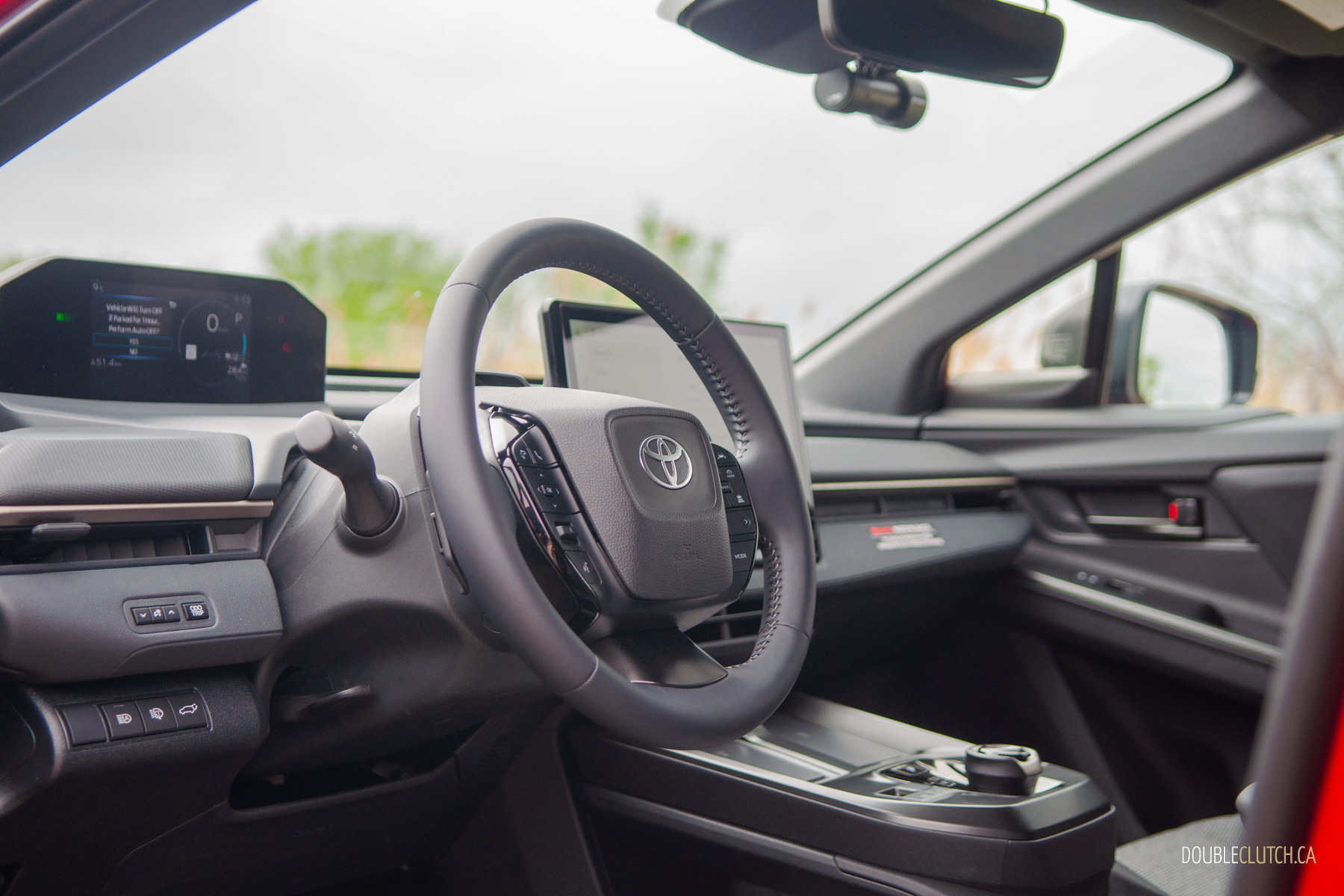 Inside, the bZ feels familiar. Right away, you’ll recognize the almost comically small steering wheel and high-mount digital gauge cluster plucked right out of the new Prius. Next to it is a subtly revamped touchscreen and climate control layout; it may look very similar to the previous layout, but Toyota upsized the display to 14 inches in order to accommodate the new digital climate controls. It’s a similar setup to what you’d find in a Lexus; we’re not overly thrilled about the climate controls going almost-all-digital, but the two physical temperature dials, proper volume knob, and hard buttons for defrost ease the sting.