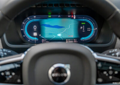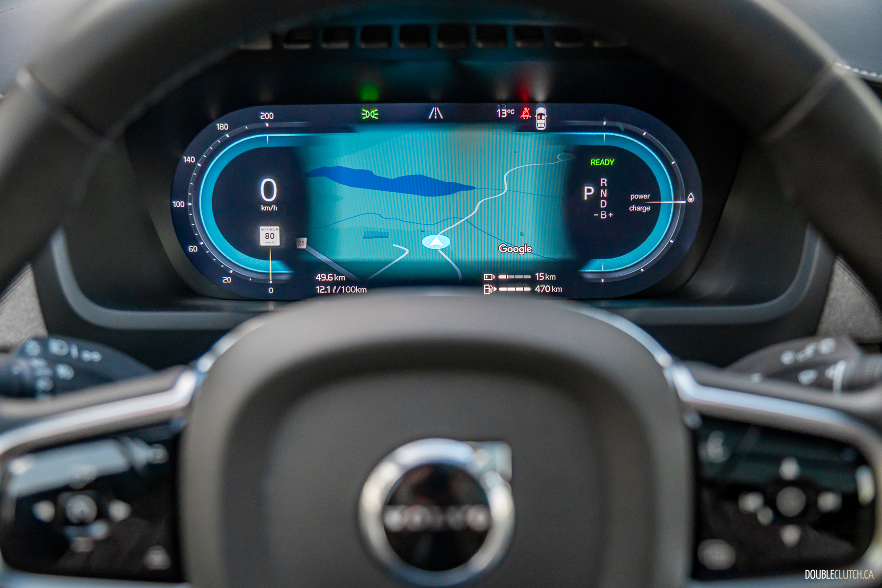 With the 14.7 kWh battery topped after a few hours on a Level 2 charger, the XC90 plug-in hybrid can go 51 kilometers on electric power alone. It’s also quite happy to accelerate to and doddle along at highway speeds without firing the gas engine at all. I love how the power meter clearly and cleverly telegraphs when your foot’s position is going to fire the fuel burner, so you can easily keep it from starting.