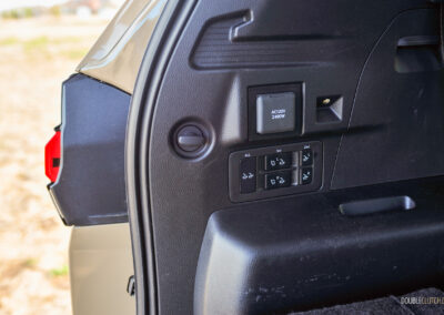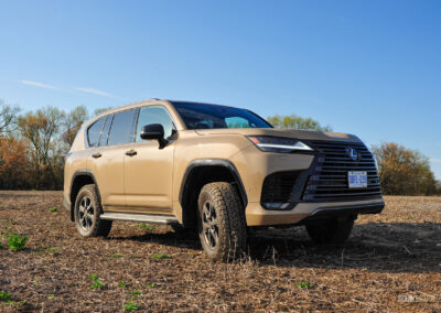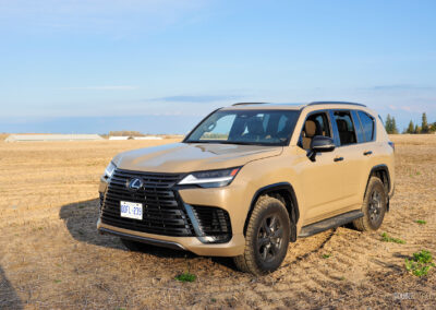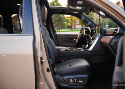 The Overtrail+ trim is also new for 2025, available in a standard two-row configuration, or our tester’s optional three-row layout for another $2,514. This trim adds front and rear electronically locking differentials, 33-inch all-terrain tires on 18-inch wheels, skid plates, blacked-out accents, and this metallic khaki colour called Earth, which is exclusive to the Overtail. On first blush, the LX 700h offers the same 8.1 inches of intial ground clearance as the standard LX, but with the addition of the hydraulic suspension setup, ground clearance increases to 12.1 inches.