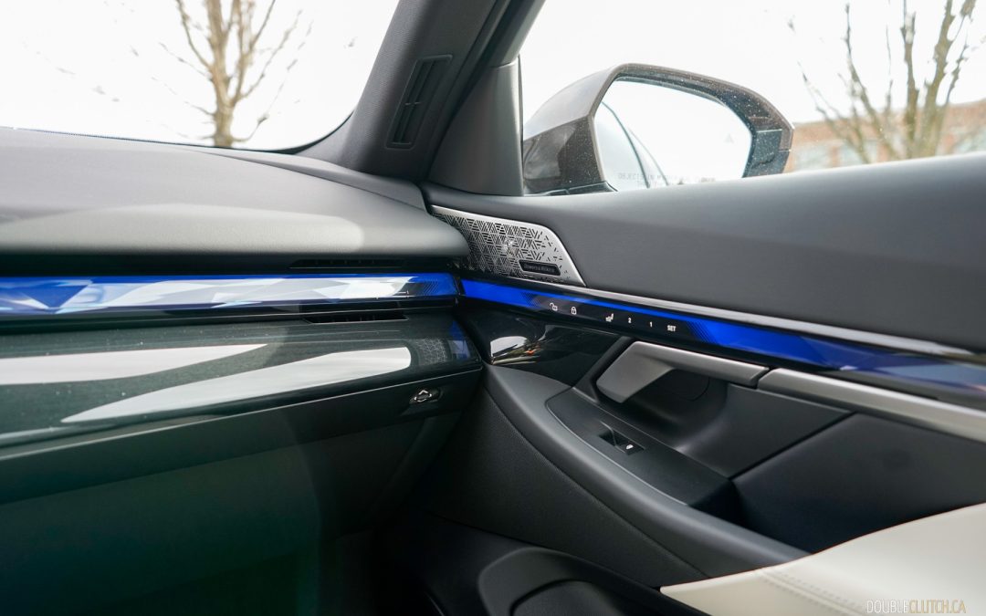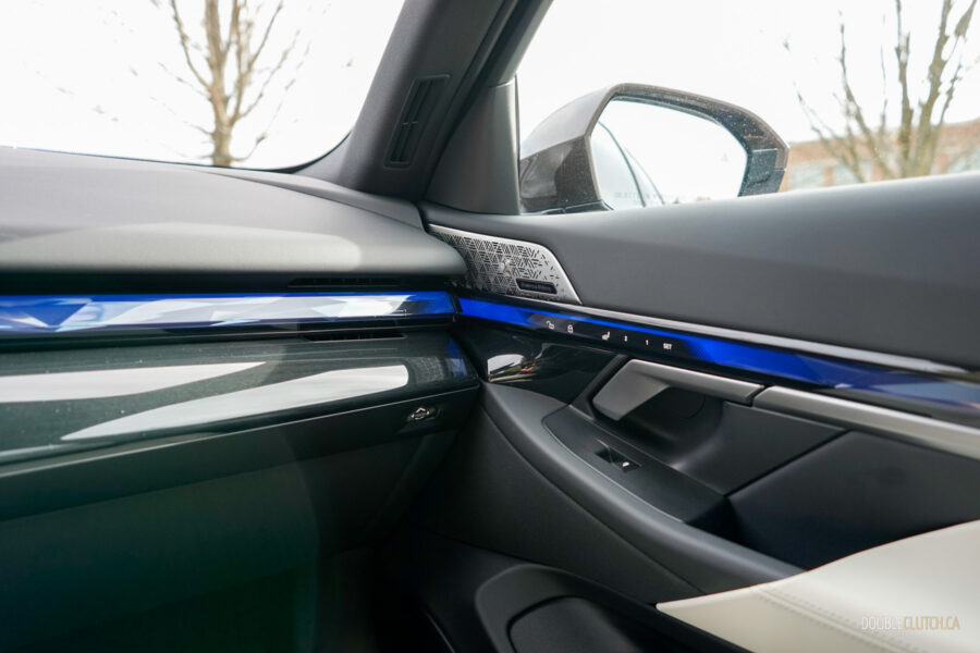 Interior view of the dashboard design and passenger-side door panel in a 2025 BMW 550e