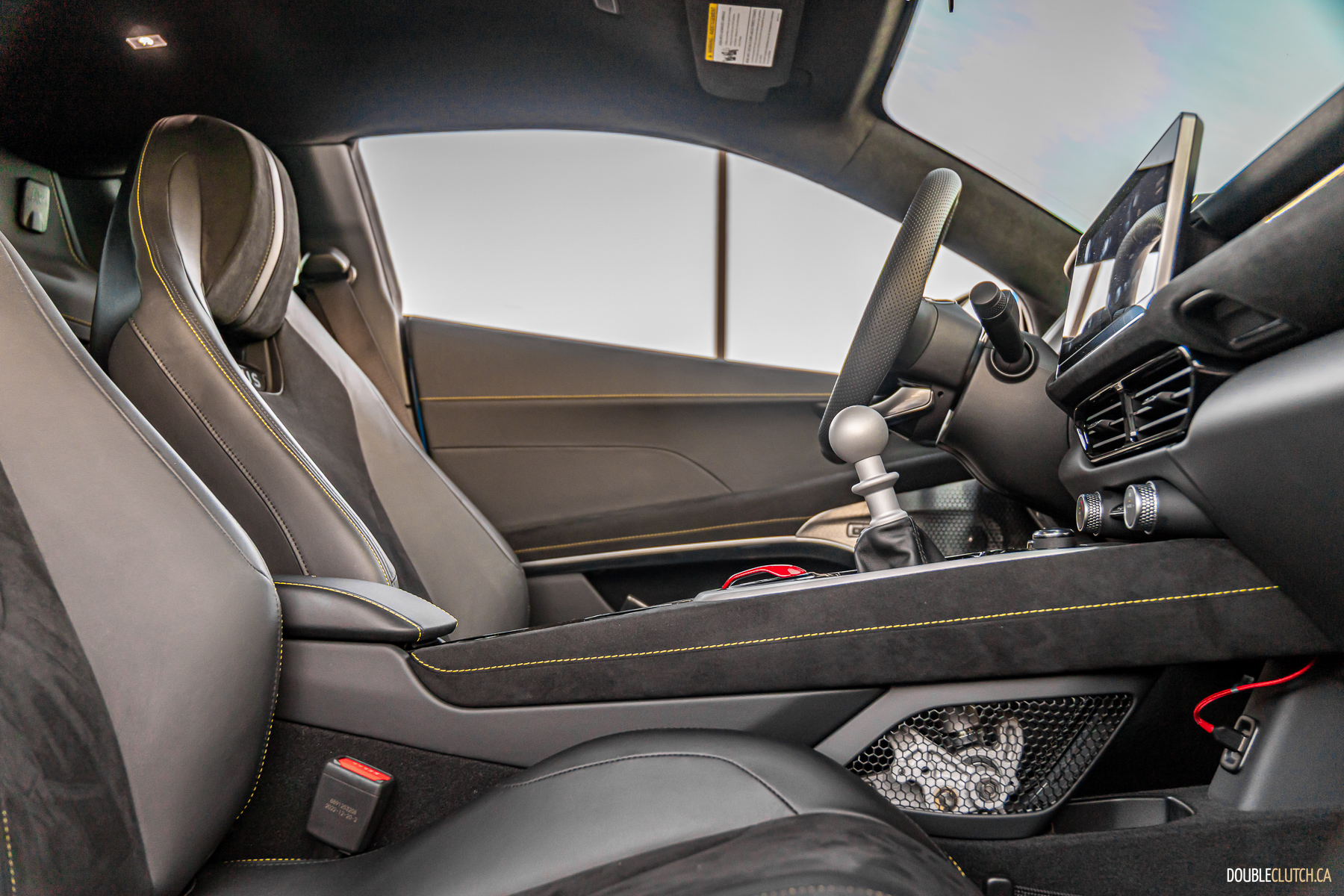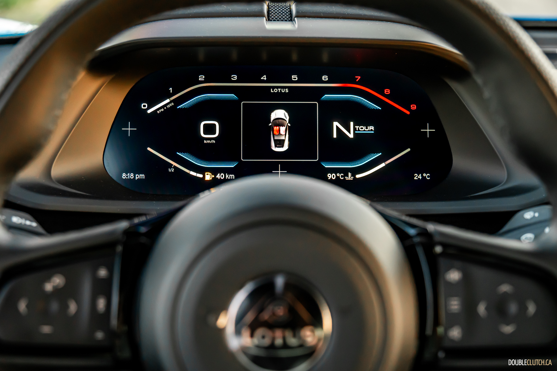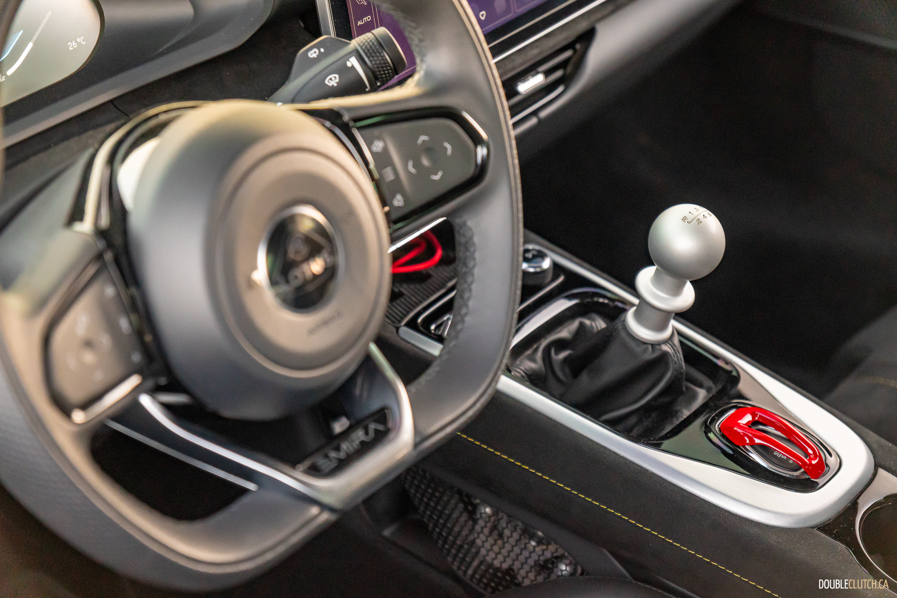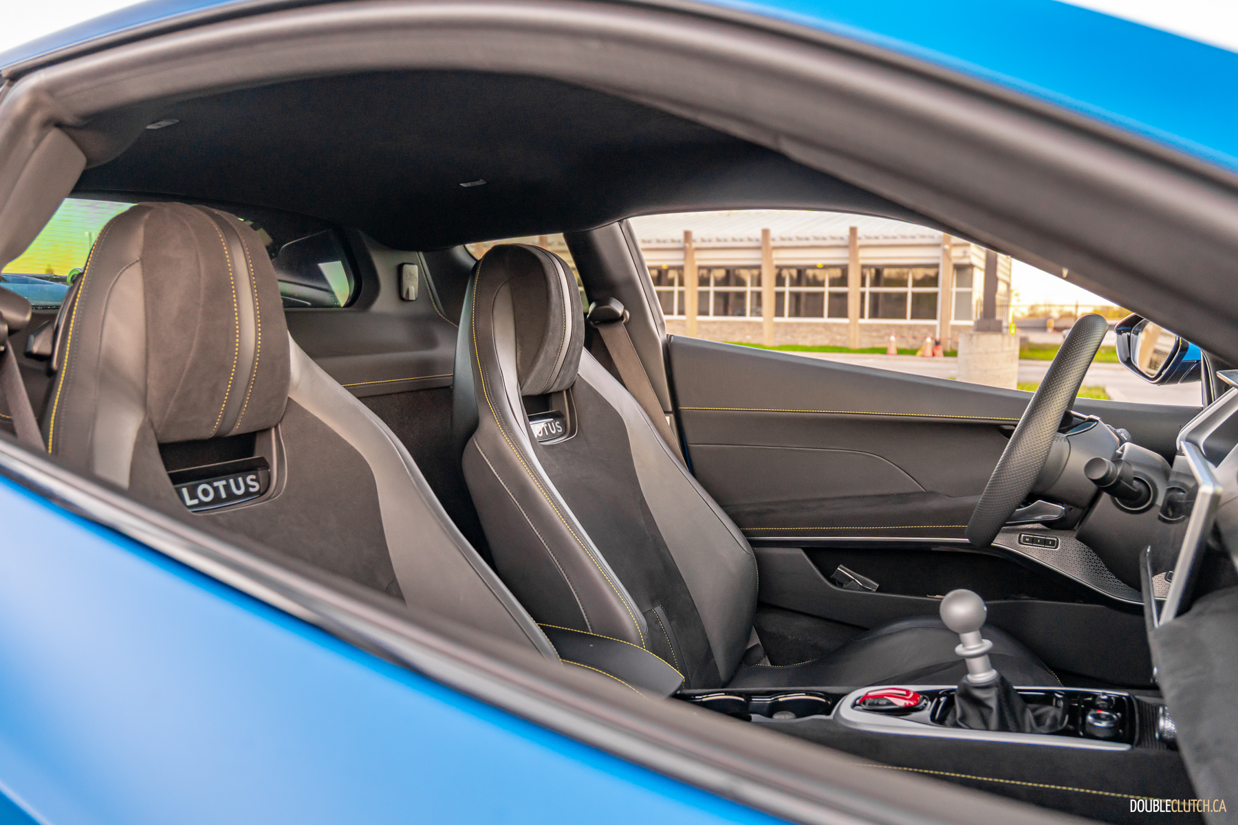 I had just barely enough light left to properly capture the Emira’s interior. It’s actually quite lovely; the seats are purposeful, thinly padded and well-sculpted for proper support without being fat-shaming. Everything throughout in this loaded First Edition is French-stitched leather and alcantara, or metal. There’s enough stylish flourishes to feel special and to give the camera something to work with, but it’s not begging for attention. The only concession to showmanship is the exposed shifter linkage, but even that is tastefully tucked low in the centre console behind a thick mesh. It’s the most flagrantly pornographic thing you can do in vehicle interior design, yet Lotus found a way to go about it that’s almost subtle and cool beyond a doubt.