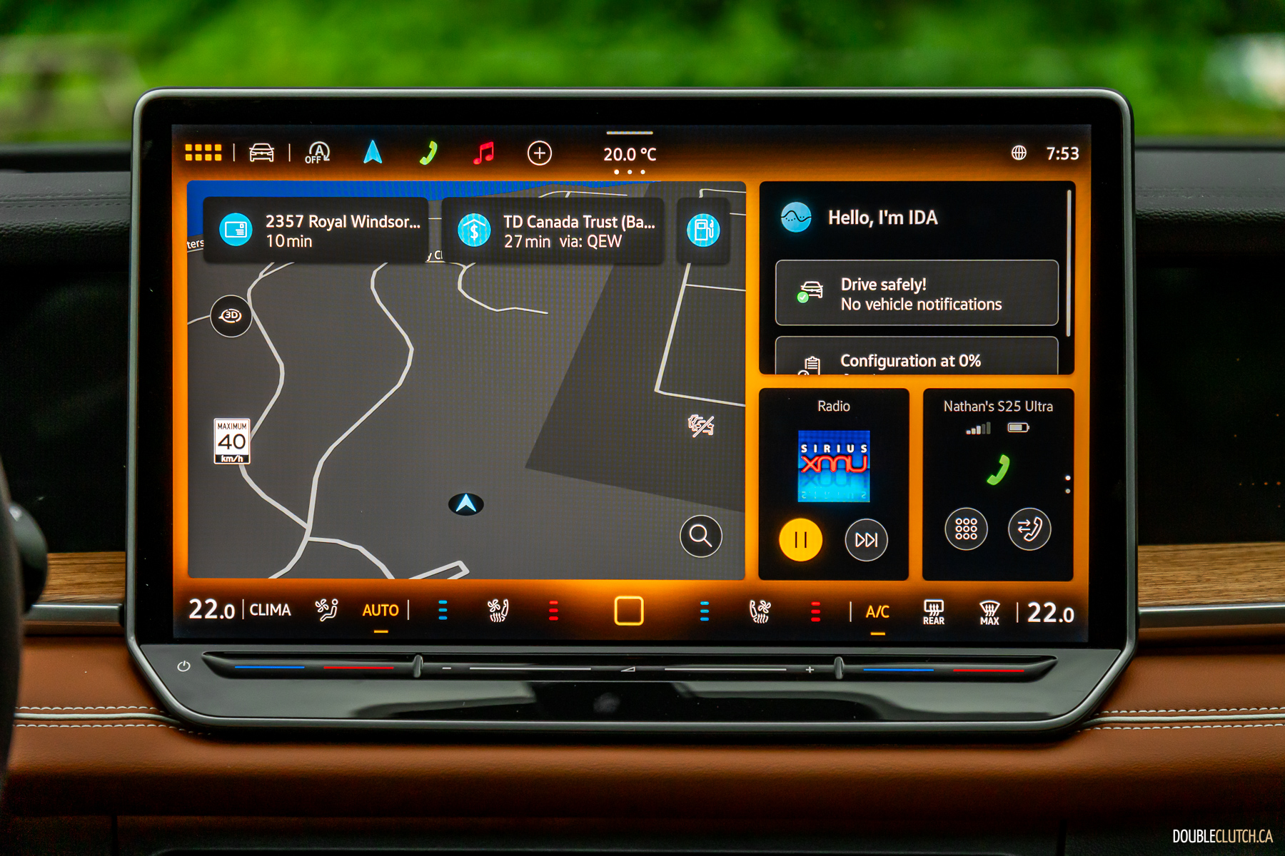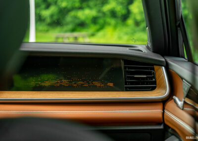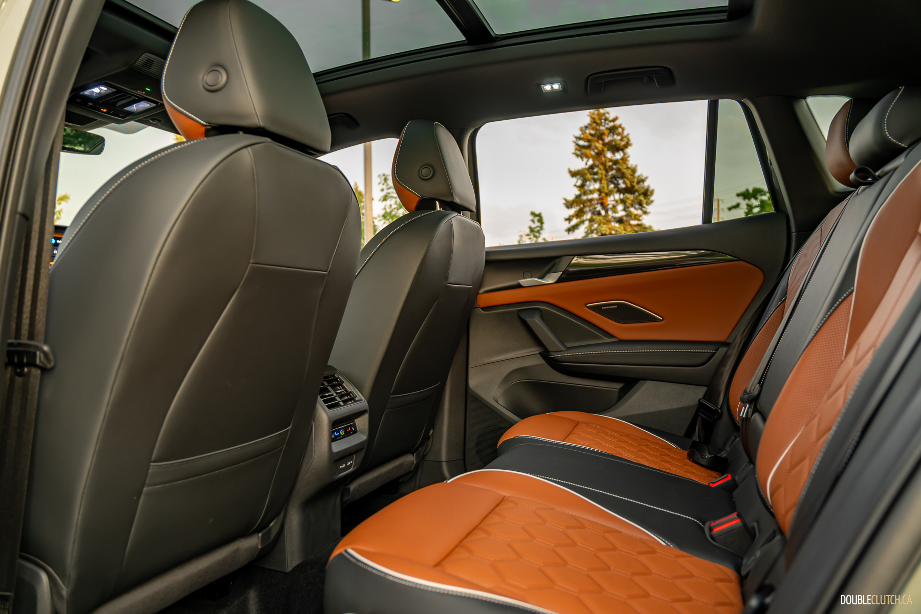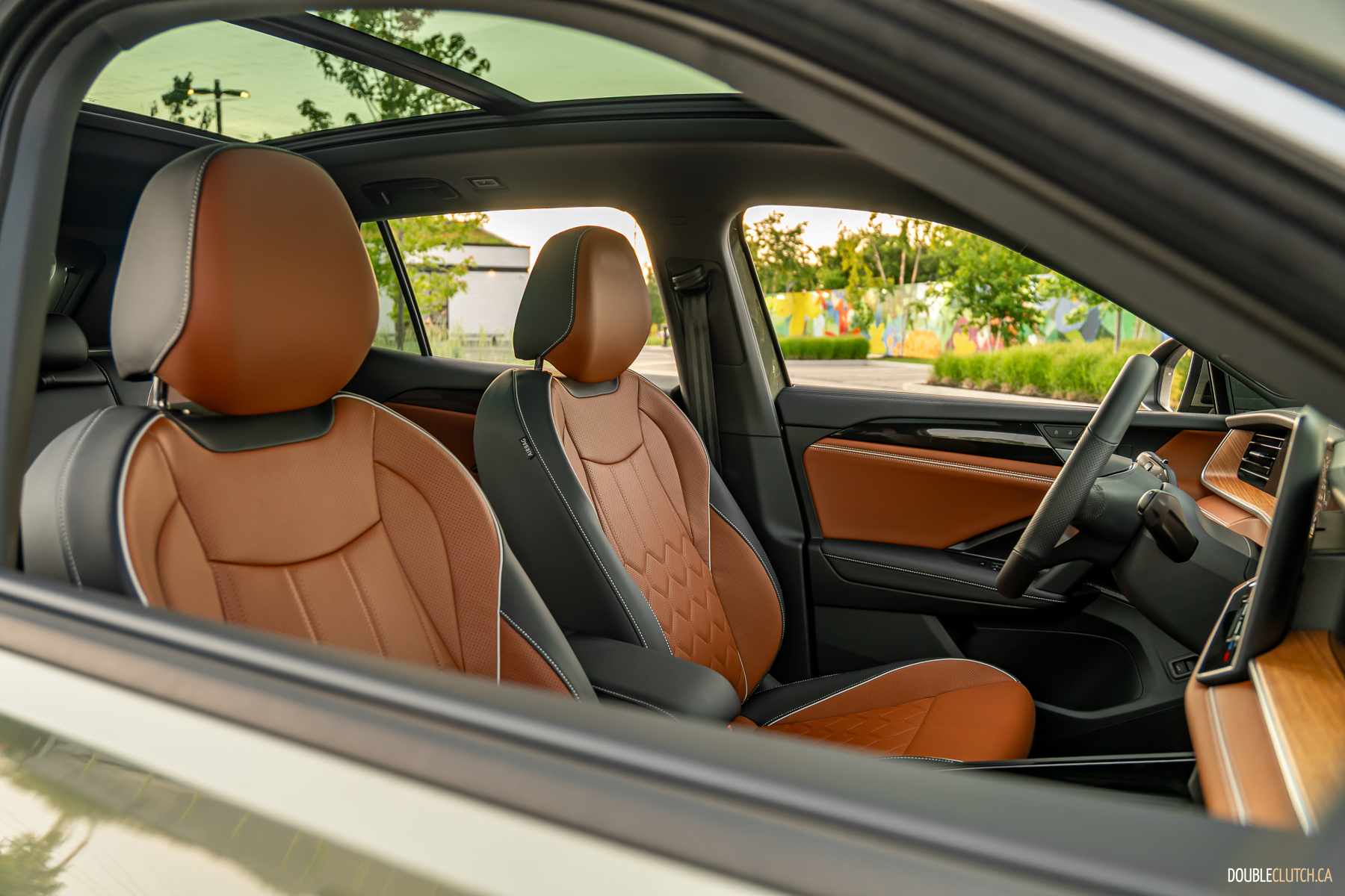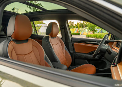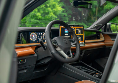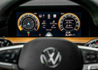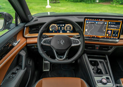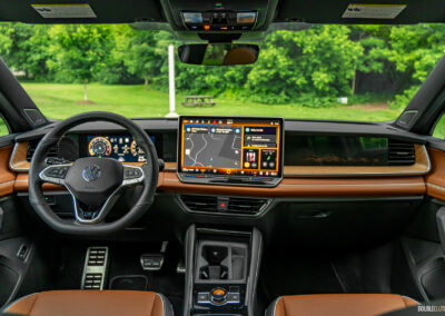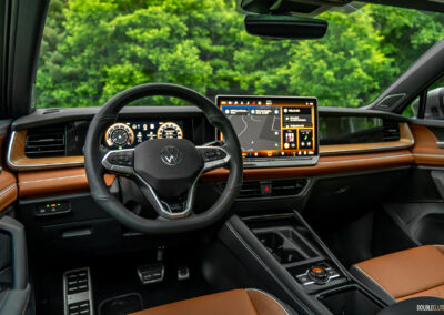 It’s a simple space and interface, but it’s about the farthest thing from being plain. Everything looks great, materials feel good enough, and the overall layout is easy to use and live with. The seats are very attractive with their two-tone quilted leather and contrasting stitching, and are plenty comfortable with power-everything plus heating, ventilation, and even massage. Rear seat and cargo space are excellent, and the optional third-row seat has been deleted. This makes sense with the Atlas around.