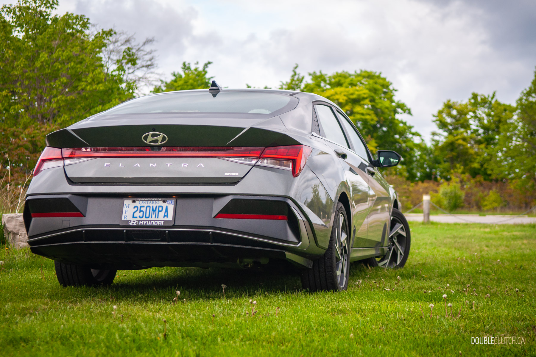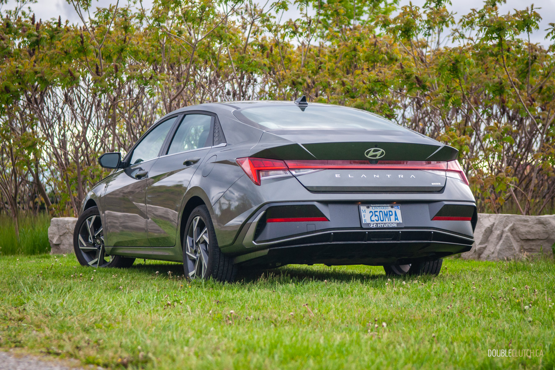 Tech-wise, this tester being the nearly-fully-loaded Luxury trim uses a twin 10.25-inch screen setup for the infotainment and gauge clusters. Both displays are crisp, bright, and easy to use; there’s a surprising amount of customization built into the digital gauge cluster, and immediately below the touchscreen is a row of physical shortcuts including a volume knob. If I had to nit-pick, Elantra uses a slightly older version of Hyundai’s infotainment software, so you don’t get wireless CarPlay or Android Auto. That’s a miss in an era where most of its competitors offer it standard.