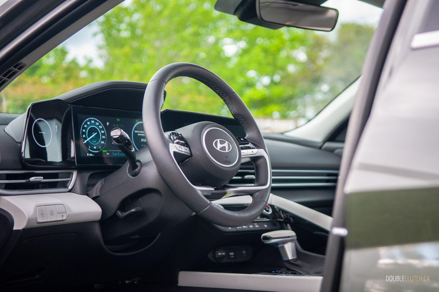 It all comes together very calmly. The Elantra using a dual-clutch means it doesn’t moan-and-groan when you get on it, like the Corolla hybrid. It also seems like Hyundai uses more sound insulation; we sometimes couldn’t tell if the gas engine was running, on top of the electric motor making the whole experience even quieter. The cabin’s commendably quiet on the highway, and you don’t feel much in the way of big bumps and potholes. On a rainy drive home, the Elantra Hybrid is a great place to silence the noise.