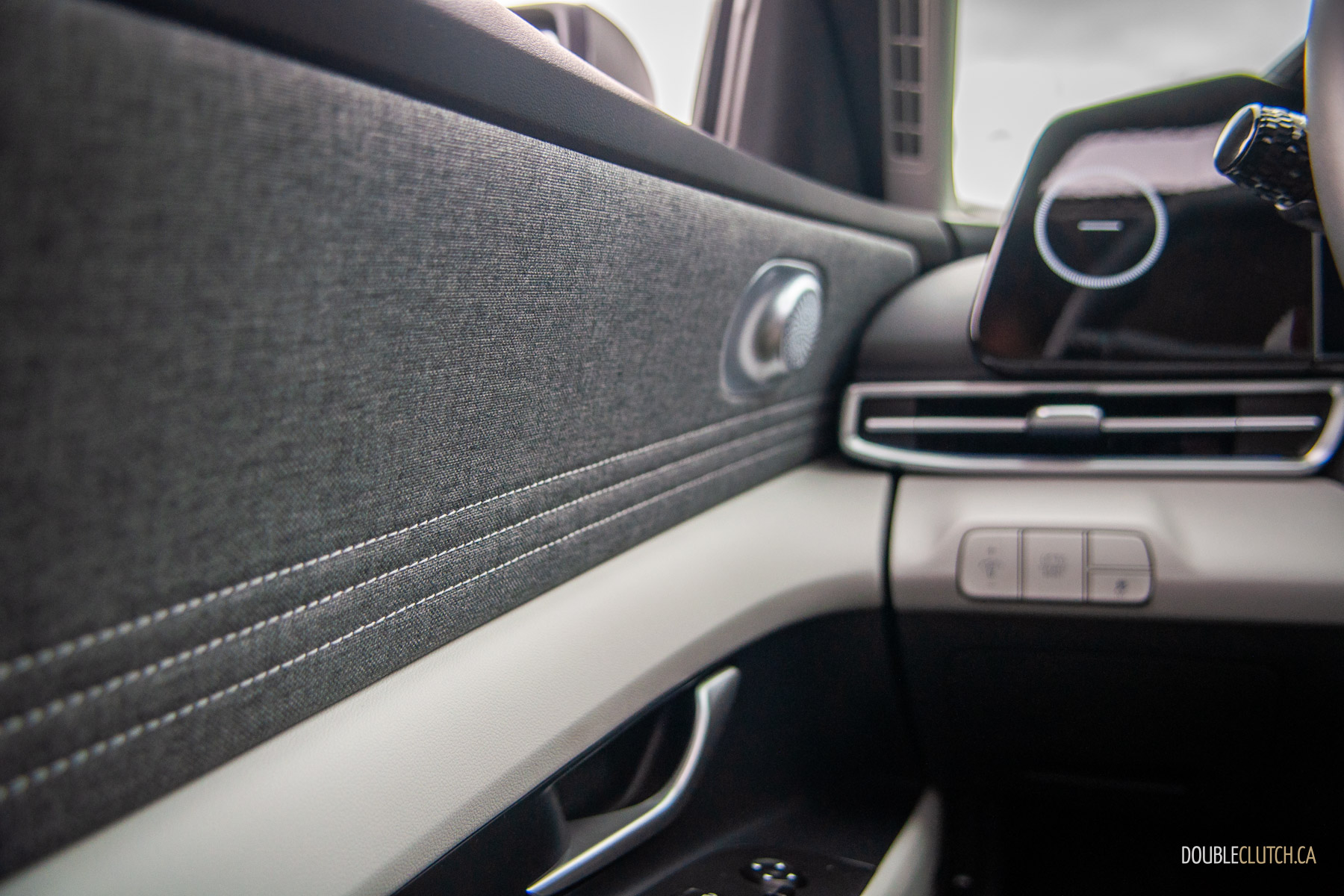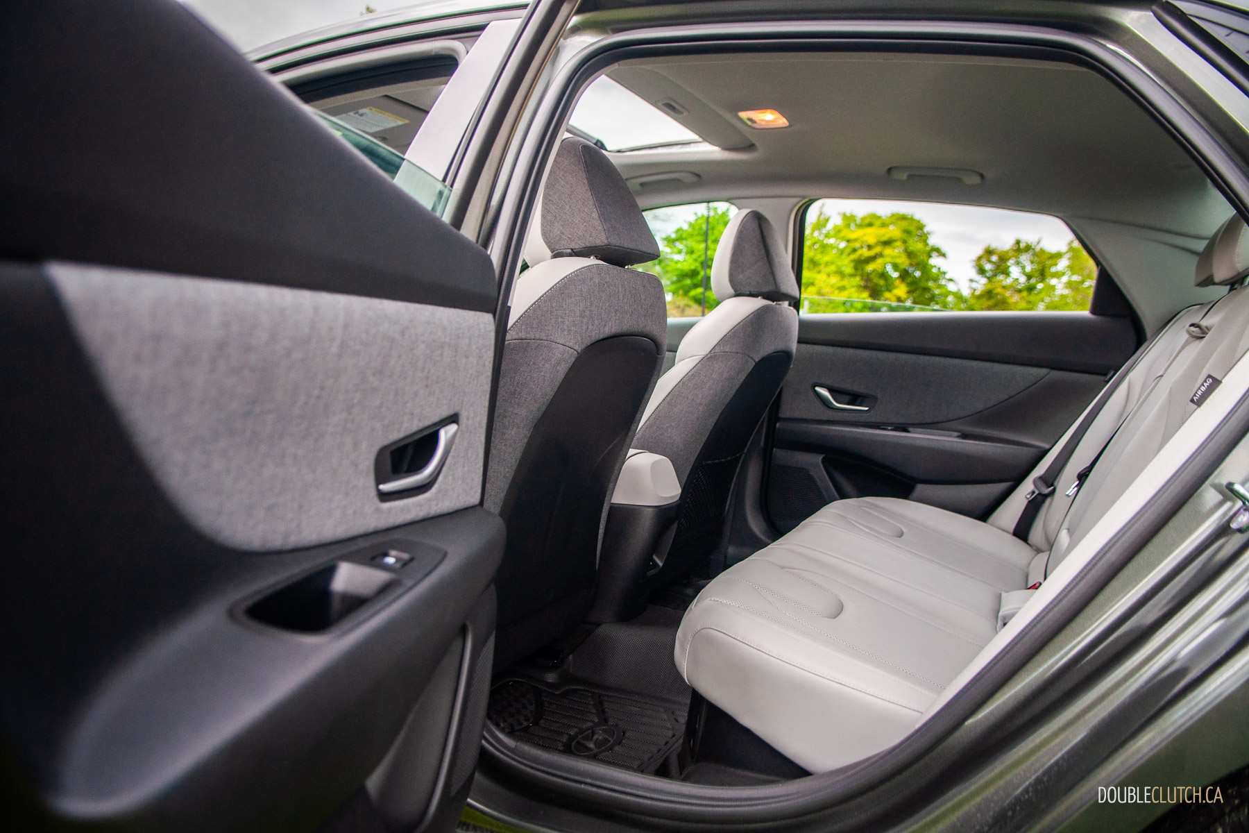 Honestly, pretty nice for the money. Competitors like the Civic and Mazda3 offer better fit-and-finish and overall quality, but the Elantra makes up for that in a few ways. Our tester’s two-tone light grey colourway brightens up the cabin a lot, the metal speaker grilles look classy, and the TV-static fabric on the door panels and seatbacks are the automotive equivalent of a tweed sport coat. Minor thing: we’re not so sure a light grey shift knob is such a great idea.